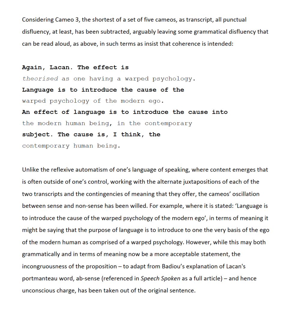 Such a practice is taken up at the level of the interspersed monologues to show and reconsider their content as potentially readable. The editting and facilitating of such readability, however, returns the spoken content to written, while reading it maintains therole of voice. The read content as short audio-recordings, termed cameos, wavers between sense and non-sense, while being read as if it were making sense. This is animportant aspect of the work’s content; that the chance encounter of the alternate lines generates language that dips in and out of sense, where reading it can both further imply sense and, without stalling through speech-based disfluency, does still expose challenges to sense. The cited theory, especially reference to Lacan’s coined term, ‘ab-sense’, as opposed to non-sense, helps to shed light on what has been suggested above aswavering of meaning. The reader can, if they wish, also view the drawings that generated, and had in their turn been generated by, the speech, although they’re not essential to the expositions’ purpose.
