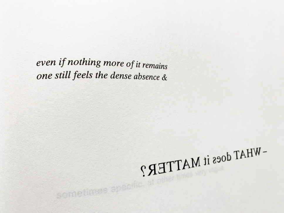 I write at the intersection of experimental/innovative poetry (visual poetry, asemic writing, performance) and the more standard landscape of the lyric. My work with language often explores the affects/effects of the poetic ‘I’, tracking its relationship to experience, subjectivity, and ethics, and utilising the power of pronouns and perspective.
