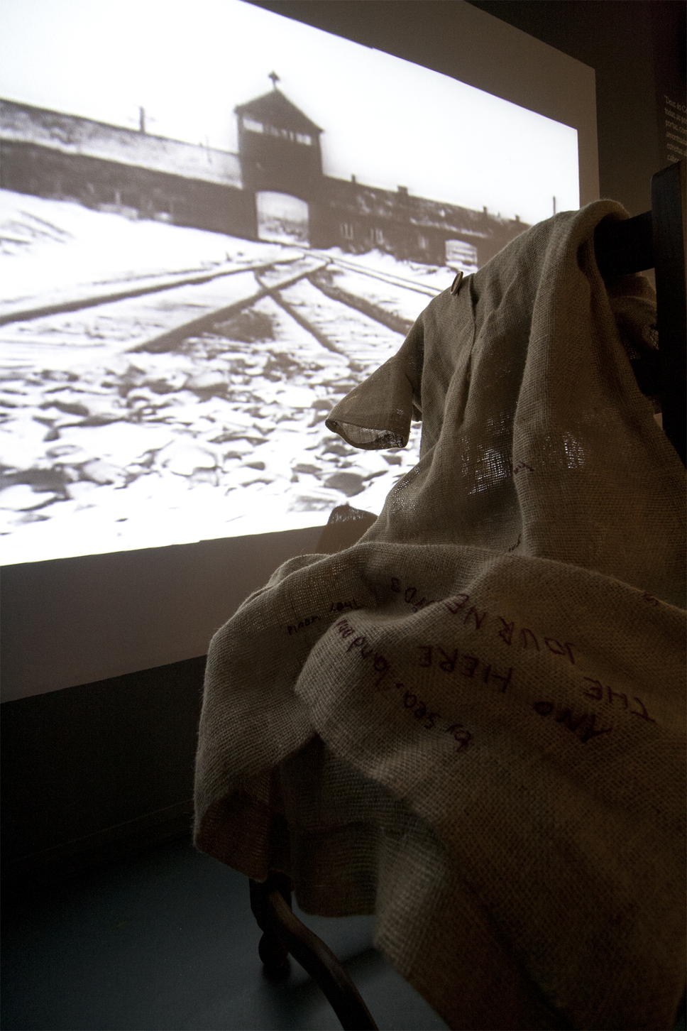 3. Adélia Santos Costa, Redress. Installation of the artwork in front of a video projection in the Memorial Fronteira da Paz Memorial, Vilar Formoso, Portugal 2022