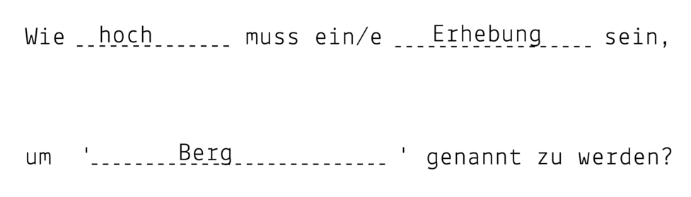 Years ago, in a Wikipedia article, I found the following question: How high must an elevation be to be called ‘hill’? It immeditely spoke to me. I stripped the interrogatory sentence from its content and turned it into a template for constrained/automated thinking: