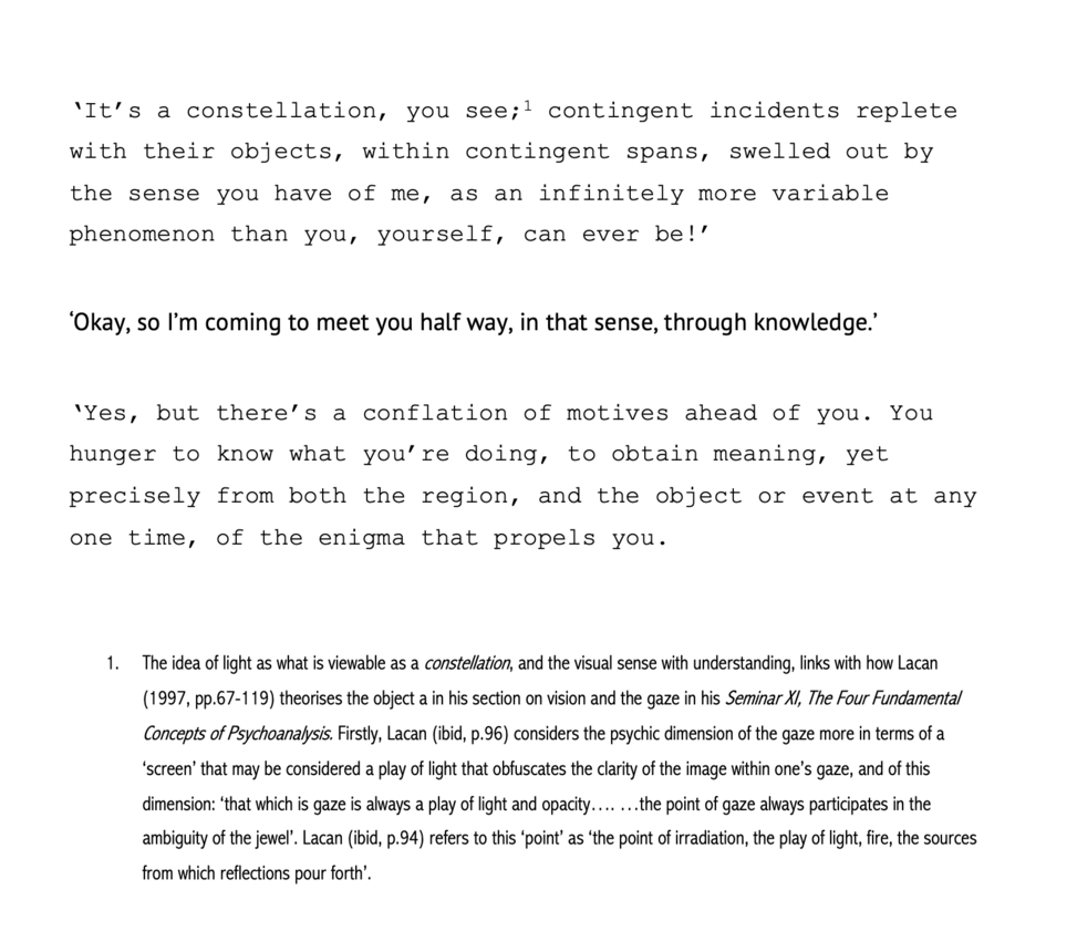The above dialigue is a fragment of a hybrid text that maps the movement of artistic research with Lacan’s Logical Square, and considers the positioning of the author as subject within such research.