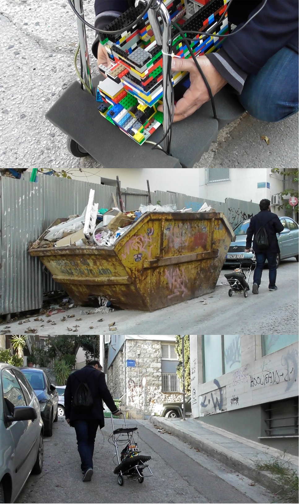 In a series of performances with oral raw material and background noises (words, texts, sound, voices), I explore through the Cipo_ program (Cybernetic Intelligent Parasitic Object), methods between public art and dialogical space in the urban terrain via sound and text where a local public sphere could emerge.In these artworks are raised questions on how the expression of different collective acts (like participation, collaboration, relational approaches) perform relationships. They manifest functional and poetic dimensions with computer and robot technologies (sensors, motors, etc.) (apparatus) on trailers (handcarts trolleys), activating sound responses dialogically, repetitively and differentially in random combinations from word playbacks (archive files, recordings from suppressed political protest demonstration of debt crisis, music notes of barrel organ ‘laterna’, garbage truck noises, soundscape, etc.).