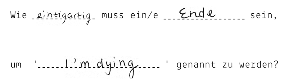Working with the same template sentence over a hundred times provided surprising insights into the potentials of constrained writing and co-thinking. A major part of the exercise consisted in learning how to overcome one’s perfectionism, in letting go. By delegating decisions to a ‘system’ – in this case, a small linguistic unit and score – the writers could not be held responsible over what was generated. Freed from the burden of ‘response-ability’ they observed how 'their' question got re-shaped, how it travelled through different brains and handwritings before returning to the original senders.