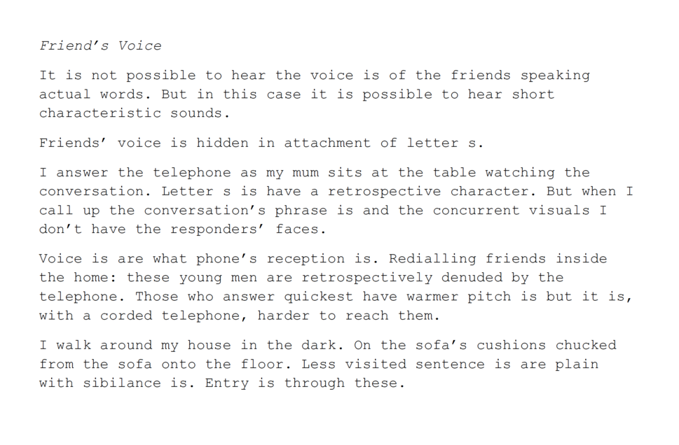 Teasing the position of letter s from its surroundings, as I do in this writing, vowels stretch into the sonic spaces that are left. This is an indirect attempt at desynching sounds from words, or at making an analogue for a remembered voice. For there to be someone else here, I chafe orthography to get little bits of sound off: small phonemic bits. Really, this is where the friend lives.