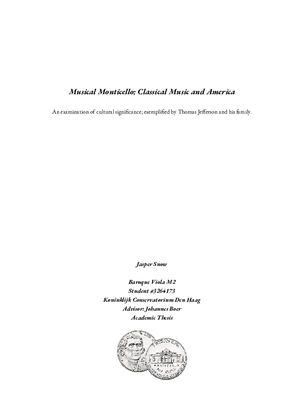 Thomas Jefferson’s Monticello plantation is here used as a case-study examiningclassical music’s foundations in the United States. Among other titles, Jefferson was a statesman, diplomat, slave master, and avid violinist. He is remembered as the principal author of the Declaration of Independence and third U.S. President. Early documentation suggests he was a gifted musician, reading notation at age nine and practicing “no less than three hours a day” for “a dozen years”. Music played an important role in the courtship of his wife, Martha Skelton Wayles, a harpsichordist and singer. They parented six children, of which two daughters survived to adulthood. Both received substantial keyboard training and their eldest inherited her father’s “taste and talent for music”. Upon their mother's death in 1782, Thomas began a complicated relationship with his late wife’s enslaved half sister, Sally Hemings. She became pregnant at sixteen and bore six of Jefferson’s children, four of which survived to adulthood. While Jefferson’s white daughters learned keyboard, two of his enslaved black sons were taught violin. It is likely that Jefferson himself taught them using the treatises of his expansive musical library, notably Geminani’s “Art of Playing the Violin”. A year after Jefferson’s death, the two sons were given their freedom; the youngest’s profession is listed as “musician” in the 1850 census; he is remembered as an “accomplished caller of dances”. These sons span the full stylistic gamut available in 19th century American music: from fiddle to violin. Thomas Jefferson and his family represent the kernels of America’s musical traditions, and the way they have morphed in parallel with America itself. The musical ecosystem of Monticello plantation is a dynamic location to discuss colonial music’s intersections with class, race, gender, and national identity.