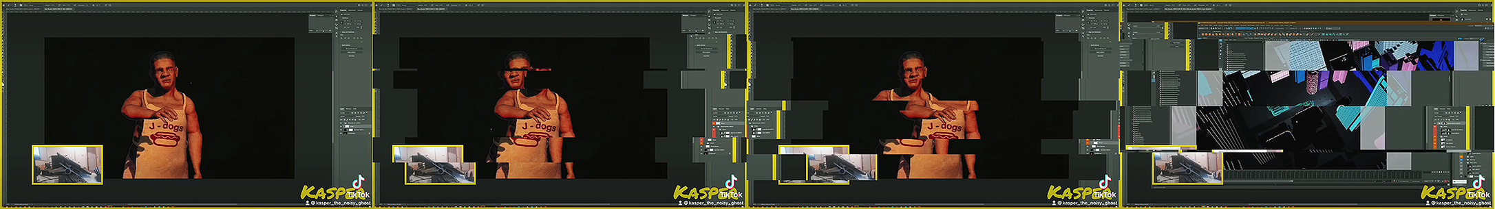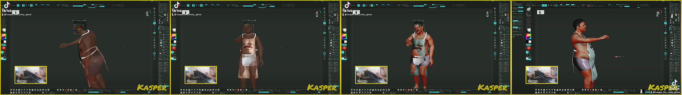 As we can see from the screenshots, Figure 5 – though not clearly without very alert attention in this extremely fast-moving section of video clip, the clothing of the model's body, the apron, delineates the corporeality as if the body were transparent, and Safa turns the model variously to make sure that the fitting, as it were, makes sense in all respects. Safa relies on a combination of perceptual skill, the noticing of the efficacy of the fit, and whatever is the range of digital tools involved in this stage in the process. The complexity of the procedures of getting there, however, are merely suggested rather than exposed by the fast speed of the frames. The video's viewer at this point may deduce the message: 'This is what it takes!' In general, in a set of video animations that we consider finished details, the variable speed stop- frame process of presentation may represent a response to the question of Bergson's (2001) multiplicity in unity for as long as one holds the unity of duration in mind (p.80). As Bergson (Ibid) has stated, such unity may be a simple act of mental consciousness. What I've done, by extracting screenshots from the videos, is to have butchered, as it were, a number of units that are otherwise orchestrated by Safa into a multiple unity. The Bergson reference (Ibid) has concerned the analogy of number for how time is 'irreducible' while one is thinking time, and unitised as countable points in space while being built – Safa's animated video pieces being ideally suited to this consideration – and then subject to divisibility again once the unit is of a fixed time-length (p.83). Digital technology allows us, as yet another aspect of iteration, to deconstruct such units, such as I've done with the present clip, to re-present them as points not in time but, as Bergson proposes, in space. While the above four frames indicate a passage of time in terms of how the model is increasingly dressed, the gaps between their rendering and re-placement in space is too great for such multiplicity to simultaneously constitute unity. Parallel to this iterative process, we see thumbnail inserts of Safa's 3rd-personing of himself as the creative agent of the work. Safa shows himself at work in thumbnail clips inside the main frame of his video, distanced by the camera that's stationed at some distance to his side, the results cordoned off as fast- frame video that's in dialogue with the iterative modelling, as if conveying the message: 'The guy in the thumbnails is me at work on the piece.' Safa's (2021) self-distancing from the work in this manner both positions him as an '...artefact in place of the subject' and in a sense justifies the statement that he makes as Tharib, that '...an auto-ethnographic approach... starts addressing the superficial details in place of the description' (p.3). While the narrative content, especially in the main referenced clip, is convincing enough, the 'details' take precedent in their sheer proliferation in the conjoined process narrative. If the process could be heard, then the zany soundtracks accompanying the videos is appropriate for the process's high-speed tempo.
