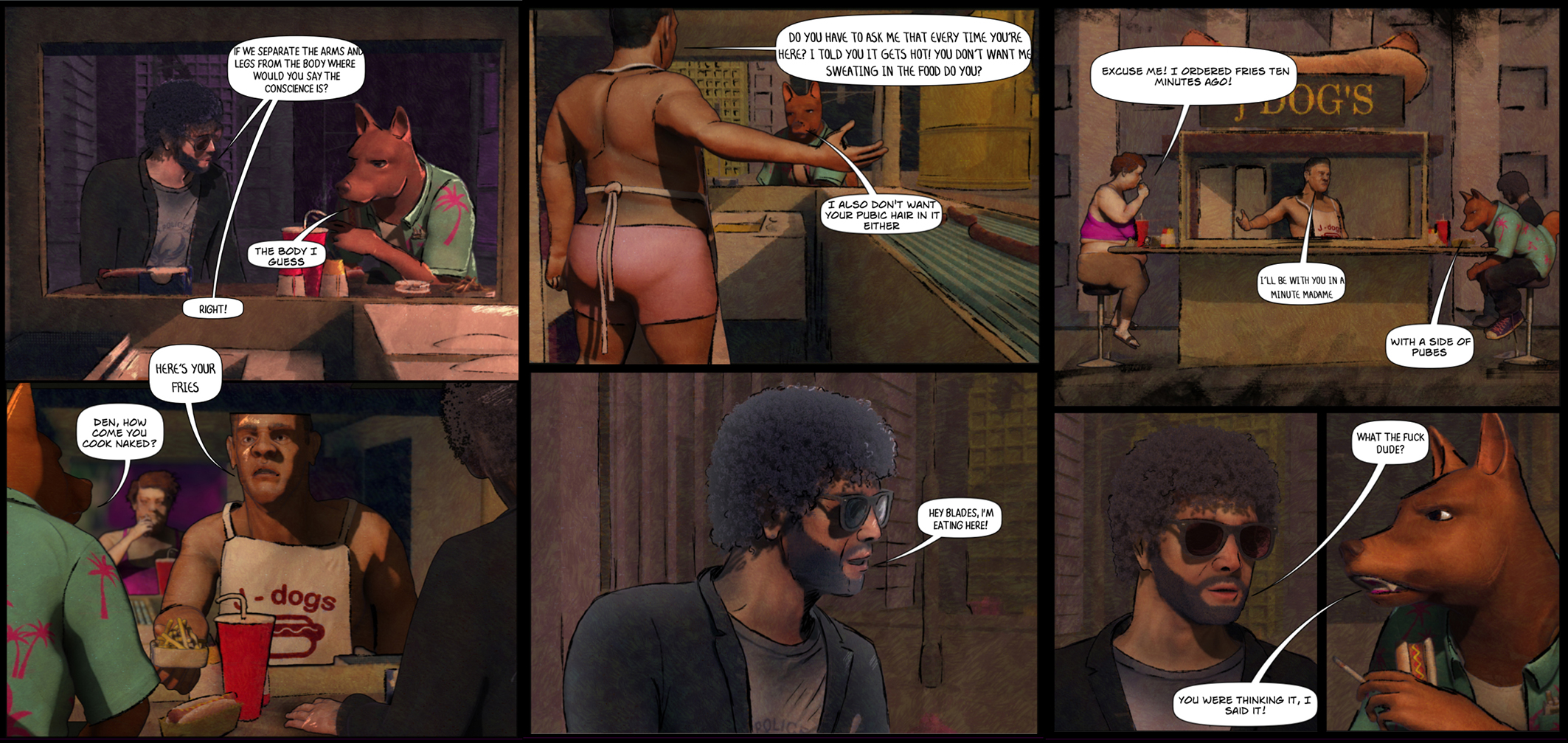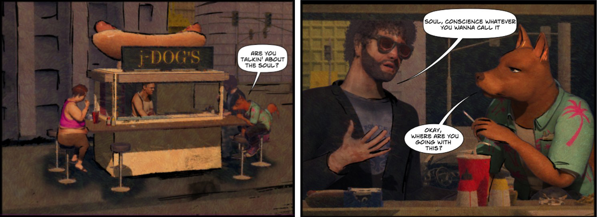 The above two screenshots, Figure 3, indicate a left-to-right sequential reading of the narrative, in much the way that video runs along. Such movement is interposed with a centrifugal dynamic, the staging of the action of which affects the delaying of time in the moment. This is also helped by the framing of the space by the characters. We see this in both screenshots, along with analogue sketch drawing onto the screen, the purpose of which will presumably be to suggest moments before or after, or alternatively to the present configuration. While whatever is suggested will concern time, as Bergson has stated (2001) of successive moments, the 'aggregate' of the moments forms in 'space' (p.80). While questions of space and time suggested by the imagery, respectively modelled and sketched, are here held in the balance, as it were, like the impending exchange of bill and hotdog, Bergson (Ibid) has proposed that such multiple events achieve their synthesis in the perceiver's mind as an act of 'consciousness'. Debatably, one brings to the necessity of reading the signs laid out in the screenshots a sentient faculty that relates to all sensory modes of consciousness, whether in real-life situations or pictorial graphics. In this sense, while the term 'soul' may at this stage be too contentious, the shades-wearing customer's suggestion that whatever they're talking about is a matter of 'conscience' does bring the question of personal morality into the reading of the screenshots: in other words: 'To what extent am I interested in this, or prepared to be interested?'