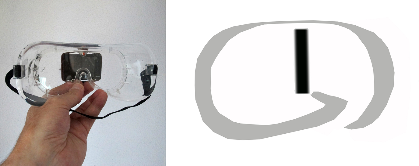 The left screenshot, Figure 11, shows how and as what image the projection downwards on the plane and forwards into space culminates. The right screenshot shows from what the image is derived; a self-portrait view into a small handheld mirror, and including the hand holding the mirror, the circle of which, and the person of whom, one might construe as being the combination of circle and yellow profile image in the previous left screenshot. The point in the middle of what I've described in respect particularly of the uppermost left pictorialised diagrammatic image, may not be understood to be the self-same representation of the self-portrait image in the mirror. If one could fold the projection back between the image, behind which is the starting point of the gaze, and the subject, terminating as the yellow self-portrait profile, one would see and sense that what travels through and from the point in the image is this mirrored face. Something else, however, which complicates the question that the image presents, is that I'm wearing a small black object in front of my face, which itself has a point, best considered as a red dot – although that is not actually it – in the immediately above left screenshot. The object is actually an action camera that records the situation, in a sense the superego Other recording my every move, the point of which is the lens.