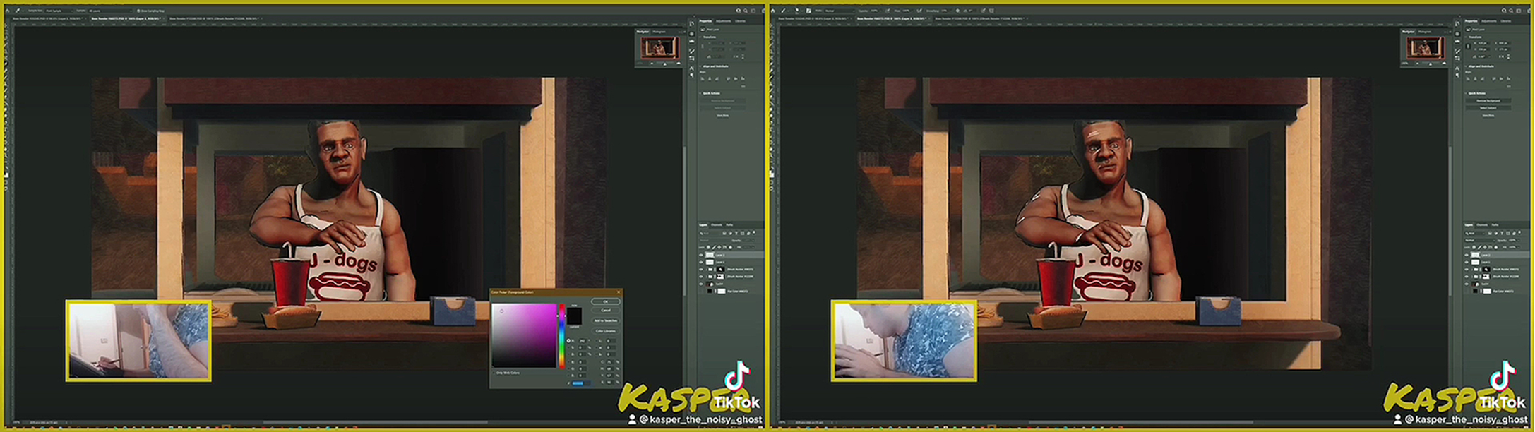 The difference between these two images in Figure 7 is merely the highlighting that appears on the arm and face of the right image in the manner of drawn marks that may indicate the basis of re-working, when Safa is seen holding a digital pen. Apart from this, the comparison between Safa and the modelled figure suggests the mimetic impulse; not exactly necessarily to make like oneself, but to understand human representation according to how much one feels one could occupy, as it were, the representation's shoes. This idea of projective embodiment has a phenomenological basis, whether generative of analogue or digital practice. The white marks made on the image are much as one might make in an analogue version, trying to feel into the form to get as convincing an appearance as possible. What's telling about this relates to Tharib's (2021) point about the 'auto-ethnographic approach' being concerned with 'superficial details' rather than 'description' (p.3). This is a polemical statement in relation to the inferred reflexivity of involvement of auto-ethnicity, in its indication that increase of involvement is concerned with superficiality of detail, which in the present screenshots is the surface of the skin. This reading is strengthened by Safa's view, in the thumbnails, away from the emerging image and towards the medium and its tools rather than in the vicinity of the gesture that the hotdog vendor makes towards whoever is in front of him who occupies a reciprocally human space. I would suggest that '...positioning the artefact in place of the subject' (Ibid., p.3) in the present context means the digital medium and its range of possibilities, rather than the video animation in its propensity to expose virtual imagery that simulates analogue practice. The main narrative clip is of course a video animation virtual artefact, but its conjoined narrative communicates in respect of medium, tools and process. This is not to say that Safa's entire work will support such an idea.