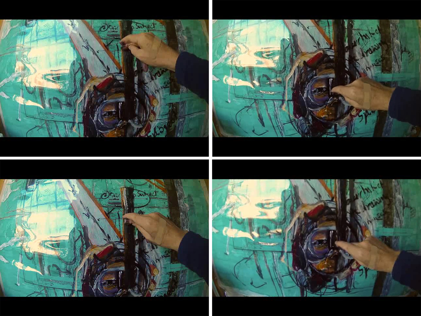 In Figure 12, the present, of Bergson's (2004) 'present image' (p.28), is the sight of myself, to me, of delineating the left side of a black band twice with each of orange and white, as shown in the two horizontal pairs. We can see the plaster still mysteriously on the back of my hand, and we can compare subtle changes in paint accumulation, image and hand position, and light reflection, in what is a stop- frame sequence. Each screenshot of the horizontal pairs will be spaced by just a few seconds, and each pair spaced for a longer period, due to the change of colour and purpose. Interesting that I've reflexively referred to the time intervals with the verb space, conferring with Bergson's (2001) insight that it's '...only as space that such intervals can be counted...' (p.87). The imploded rectangle of the action camera, the aforementioned black band, is an optical, illusory image that I see from behind and looking from either side, while its small black-box format is worn over my eyes; the tool that, by recording, makes the process available to see after the event, but in real- time, to both the viewer and me, but at the time of the real- time is not only seen by me, but constitutes the principle image that I can never get away from.