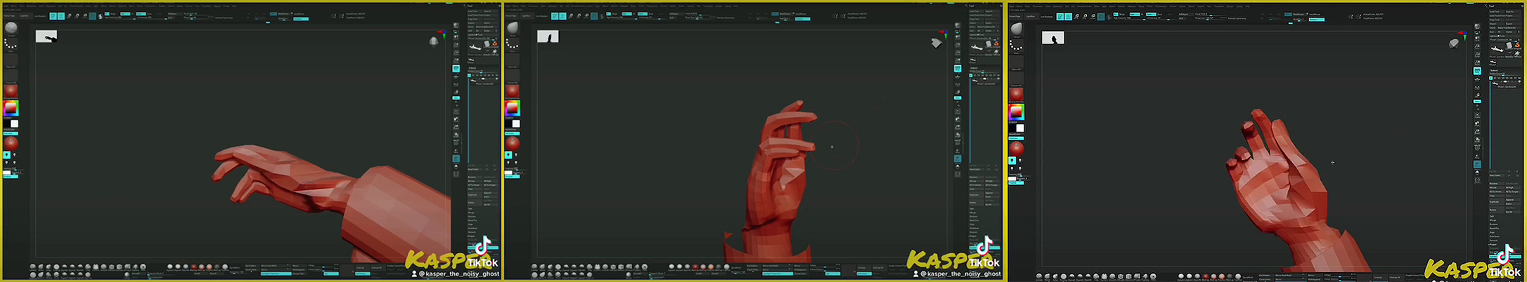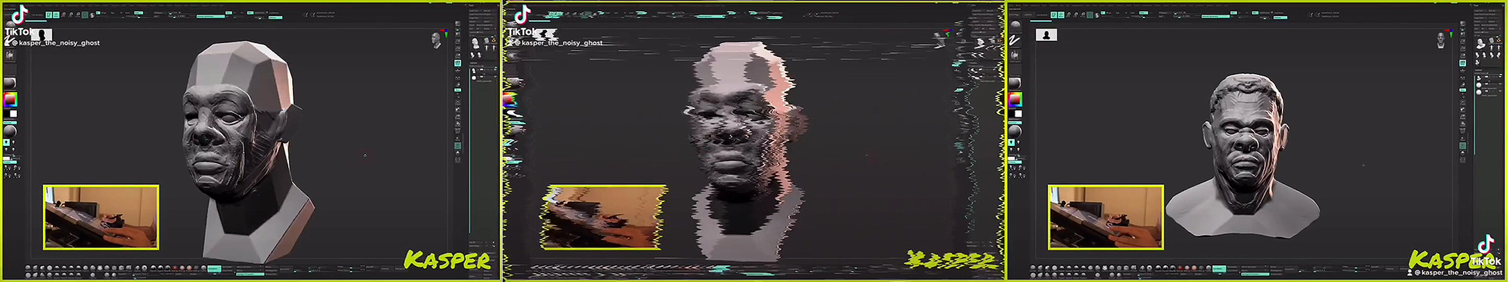 ln this sequence of screenshots, Figure 4, we have a motif of the narrative isolated to show a process of subtle iterative modelling, again where the digital drawing on the head may be likened to incisions in wet clay. Safa's clip appears to shudder in the middle, which indicates change and decision-making within the process. In the still- frame screenshot, however, not subject to fast- frame, there's a different sense, the fuzzy transitional image appearing to indicate indistinct vision, or something registered at a distance or in passing. The digital result suggests simulation of several perceptual readings, but is not in itself perceptual. One might think of an image pressed into modulated grey plasticine and kneaded with one's fingers from side to side - but this calls to question the paucity of corporeal involvement in digital modelling. Arguably, one relies on memory, or one's skills of matching digital appearance to three-dimensional reality to achieve a simulation. This latter point may have bearing on what Safa (2021) refers to as a 'shapeless digital medium', where the consequent '...explorative study into something that is unknown' appeals mainly to the cerebral (p.2) – a discussion of soul and conscience through an appropriately rarified medium, while bodily matters are meanwhile satisfied by a burger. What compensates for the medium's lack of authentic corporeality is that the digital medium opens up iterative modes of working that '...may not have been possible before' (Ibid). One may be reminded, also, of the German painter Gerhard Richter's use of blurring of photo-realistically painted imagery, achieved by feathering a soft brush from side to side across still-wet paint. According to McCarthy (2011), blurring in Richter's painting concerns both '...memory, its degradation', and '...recalls camera movement and errors in printing' (para.5; 6). However, while such references are respectively cerebral and mechanical, their means of re-presentation are physical as well as visual for the artist and convey visceral and tangible qualities, and often even the smell of paint that's still available to the viewer, rather than the several stages of remove of digital simulation: arguably, this is the critical challenge that the digital medium presents itself.