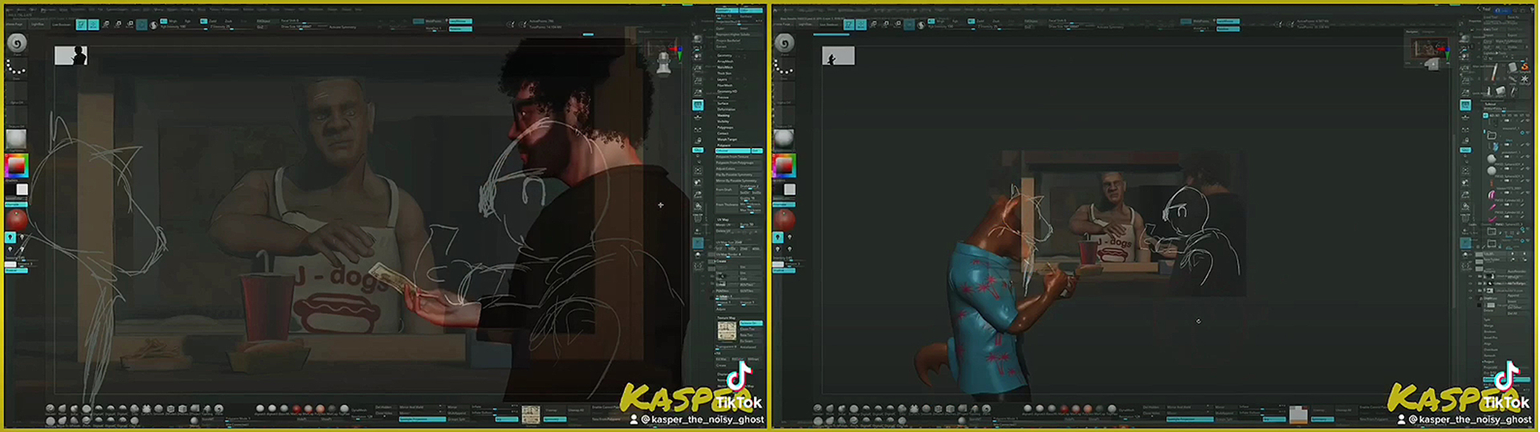 In Safa's narrative clip, a note is seen being used to buy a hotdog. As well as this, however, importantly for our greater project concerning perception, one sees the note being made and varied aspects of the complex process of making the scene on the computer, in practice, as also the work's narrative. A reason for this, if not the only one, is to convey the principle that digital 3D designing involves what, according to Safa writing academically (Tharib: 2021, p.1), can be an indefinite process of '...iteration and reiteration due to the ability to undo and redo changes', which may be considered a mode of drawing within digital designing – interpreting drawing in an expanded sense.