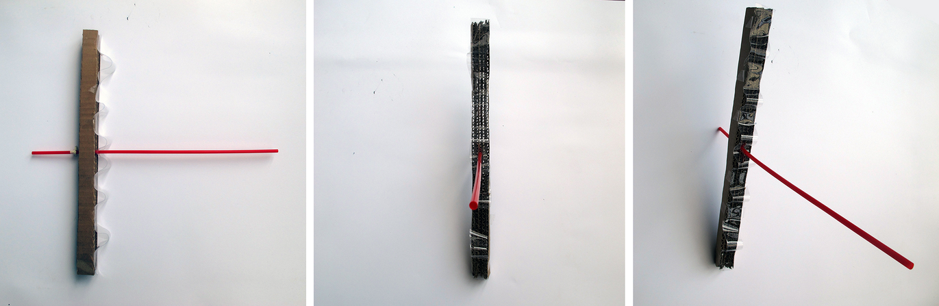 The image painted onto the tablecloth paper in black ink, through which a hole appeared in the middle, plus its obfuscation by a psychically determined screen – following Lacan’s theory – gave me the idea to construct the image as a kind of three-dimensional diagram, Figure 14. The hole through the image, which I considered standing for the aperture of axis of the object a from the gaze behind the image to the Subject, I represented by a red straw that passes through the corrugation of the diagram’s corrugated cardboard basis. It’s the straw, in effect, that opens out and becomes the mirrored self-portrait/action camera image. The narrowness of diameter of the actual straw can now easily also stand for the wart.