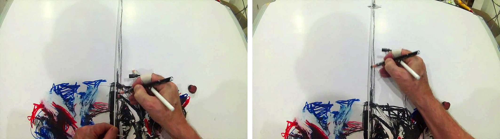 Figure 8: Screenshots from video clip of Mike's earlier work to show a spot on the back of hand, in relation to tips of pencils
