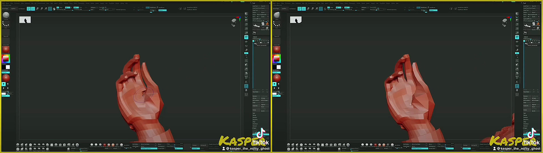 In the screenshots, Figure 2, hidden in the speed of the animated sequence and in a sense not meant to be noticed except by the surreptitious intervention of pause and slide, one sees what Safa (2021) means by '...a fluid mode of working that can be constantly tweaked and iterated on at nearly every stage of production if not every stage' (p.1). Here, fluidity may mean versatility, when the process is conducive to constant reflection rather than any more reflexive mode of working, as when Safa (Ibid) cites several authors on reflective practice (p.3). Where this point in Safa's paper gets very interesting for me is when, in the context of '...positioning the artefact in place of the subject, he refers to an 'auto-ethnographic approach'. In the above screenshots I'm presenting how the hand is held up as such an artefact, that may be considered to replace the subject, the better to scrutinise a point of detail and tweak its iteration, as if a surgeon were showing a patient where an incision would need to be made in their dysfunctional hand to recover movement. Coincidentally, I tend to use Dermatograph pencils for drawing, which are also traditionally what surgeons use for marking prospective bodily incisions. The movement indicated in the implied gap of time between the screenshot pair is the unnatural separation of what Bergson (2004) has described as the obligation of the 'present image' to ...act through every one of its points...' (p.28); if this were true of the sequence at this stage in the process. We see, instead, a mode of scrutiny; Bergson's (2001) mode of 'clear' and 'impersonal' of perception that – one may still consider even in this digital and arguably more pragmatic approach to practice – emerges from the 'confused', which Bergson has suggested is inevitable, because once confusion is arrested (to use Bergson's term) its basis in movement is negated (p.129). Confusion is in this sense not intended to be negative, but arguably does not lend itself to a process that simulates movement through a continuously iterated still-frame mode of practice. In this sense Bergson's (2001) point that you cannot divide a 'homogeneous medium' is relevant, since when you do, you cease getting time as pure duration but intervals of space (p.87).