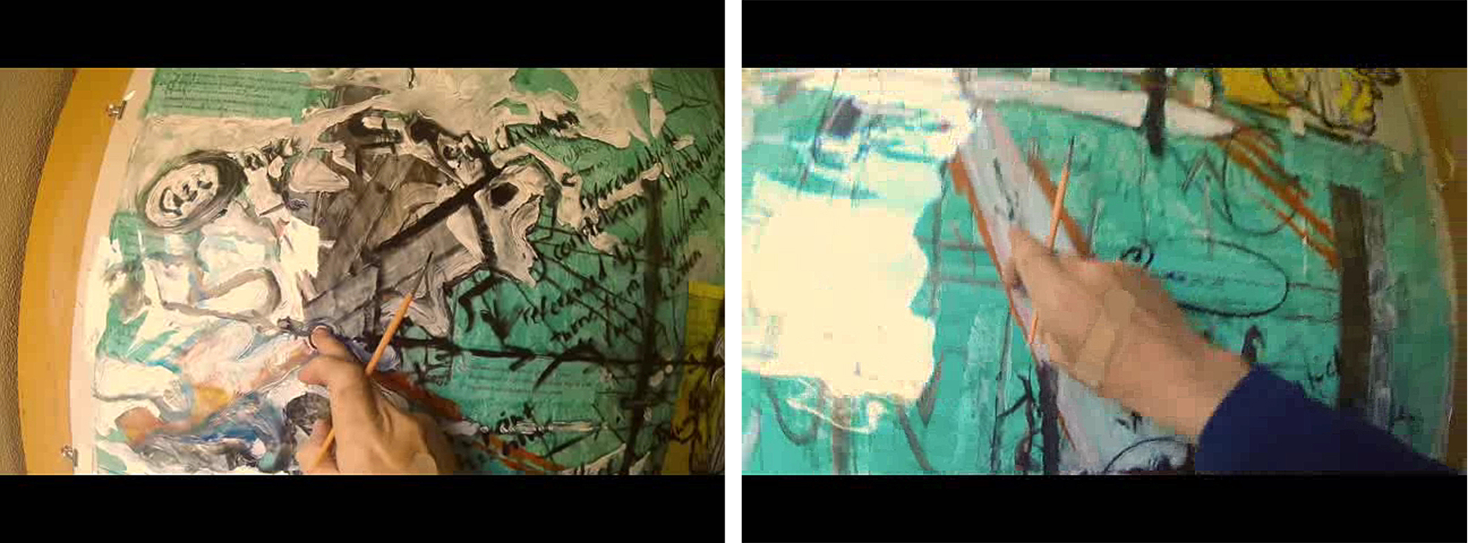 While Safa's work is constructed from and reflects its basis in the digital programs Photoshop, Zbrush and Maya, my own work emerges as analogue drawing and the various mediums involved, simultaneously with the audio-visual recording of the drawing as it develops, and the recording's simple editing on iMovie after the event. While Safa's main representative video clip, even while a small section of a larger project, fast-frames several months' work, my own videos convey but a few moments of real- time. In both Safa's and my cases, the artwork is an integration of content and process, Safa's involving an extricable narrative that the process enables and supports, and my own some content that is brought in from outside, as it were, but is more an expression of the process by which it's engendered.