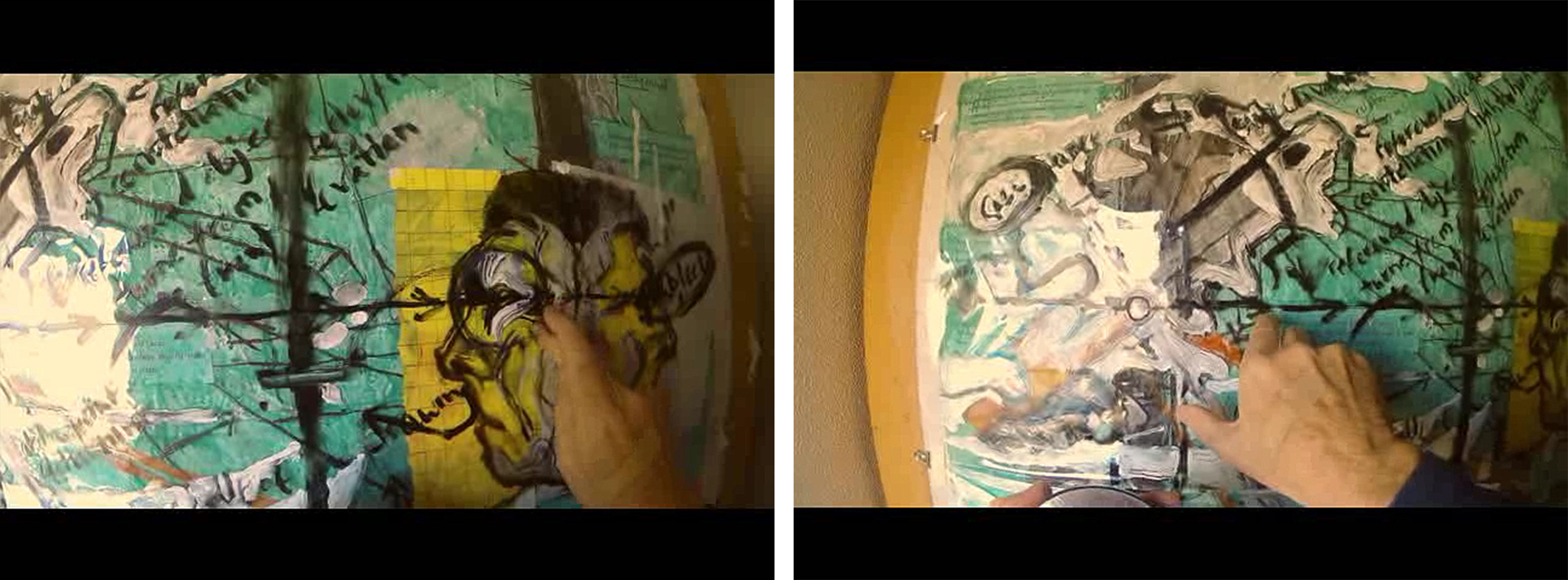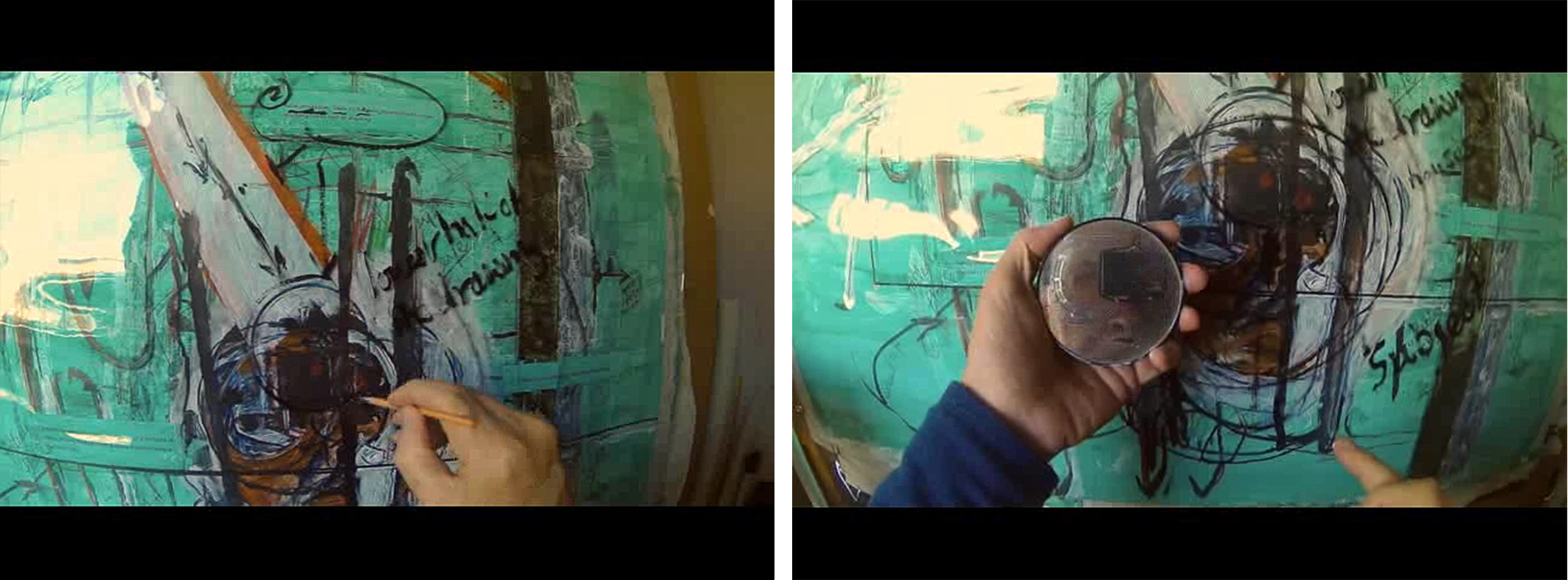 In Figure 9, the first of a set of screenshots of my own work, I'm conflating time as we experience it passing as our individual consciousness, of both my two video clips with the idea of a Lacanian focused Real- time. What's visible here in the screenshots is a diagram, unclear of what, as yet and if ever, that has developed pictorially to achieve a degree of image status, where I'm pointing to a point on it, in the left frame, and following what has been an indication with arrows of the point's projection forwards in the pictorial implications of space. To know more of what this pair of screenshots is about will have meant watching and listening to the above left video clip in advance. However, the other point of showing these particular screenshots concerns the evidence of the plaster that now covers the spot on my hand, visible in the previous set of screenshots. It might now be asked whether what one knows is under the plaster, in whatever condition, has any connection to the point indicated on, also in and underneath, the image in the left screenshot. I'd like to suggest that the coincidence of the points is a mock-up of a contingency, where the idea of pictorializing a diagram has now taken on a new dimension.