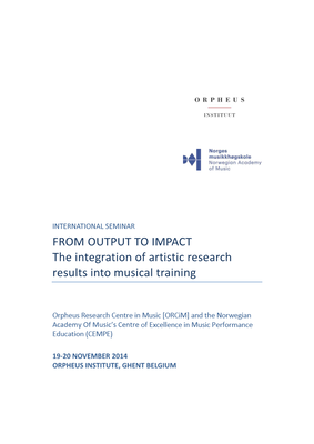 On November 19 and 20, 2014 the seventh International ORCiM Seminar, a joint effort of Orpheus Institute (Ghent) and the Norwegian Academy of Music’s Centre of Excellence in Music Performance Education (Oslo) was held in Ghent (Belgium). The two-day event offered the opportunity for contributors from around the world to gather and explore the theme of the integration of Artistic Research (AR) results into musical training at the conservatoire level.