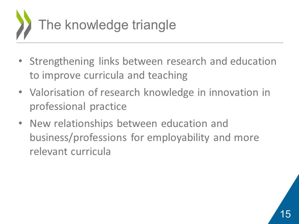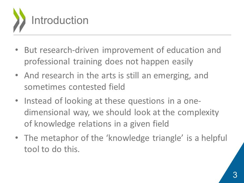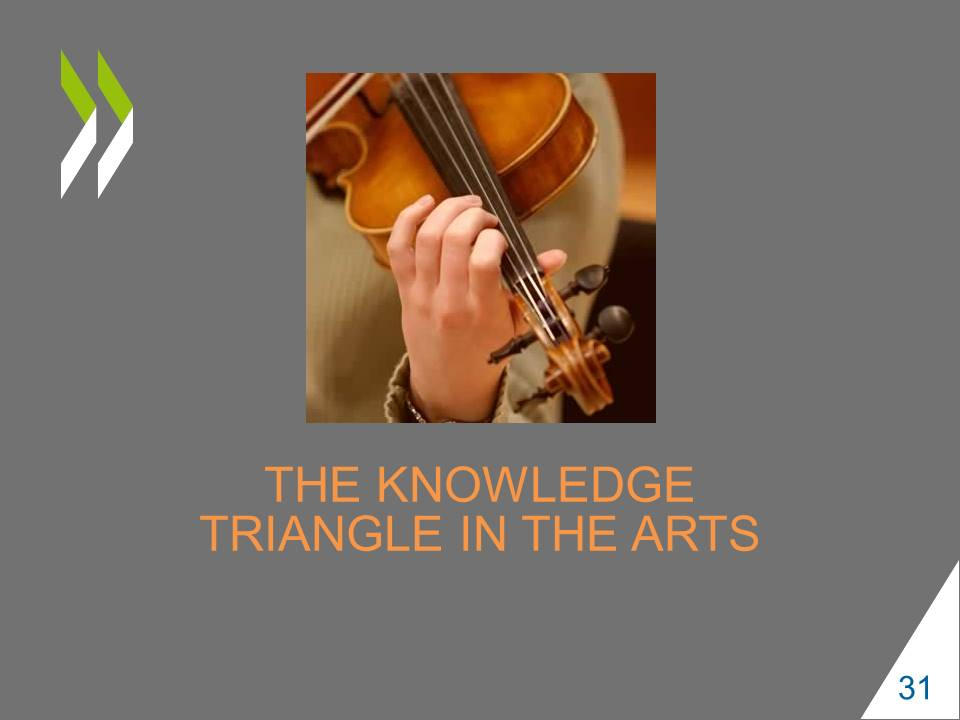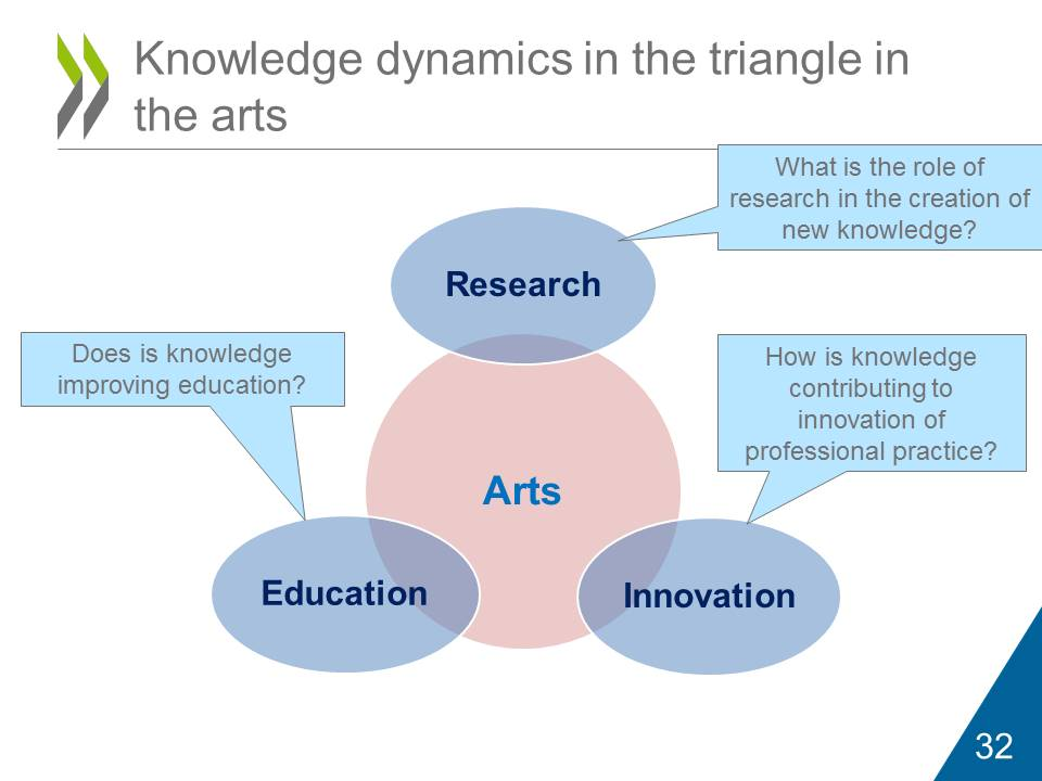 In any developed knowledge system there are various, and often competing knowledge systems. The metaphor of the ‘knowledge triangle’ offers a useful approach to analyse the relationships between the knowledge flows in research, innovation and education. Especially in higher education these three dimensions interact in often complex ways. The arts is no exception, but various forms of knowledge creation in the arts through research and innovation are still not fully developed, at least compared with other sectors. The arts also seems to be characterised by various other knowledge systems which compete with the others, such as the professional knowledge of the expert practitioner, the tacit knowledge of the initiated in a specific form or practice, or the specific knowledge systems associated with schools of thought and practice. Any sector needs to define its own ways in organising the knowledge triangle, in streaming the various knowledge flows on institutional patterns and in making them transparent to researchers, practitioners and professionals.