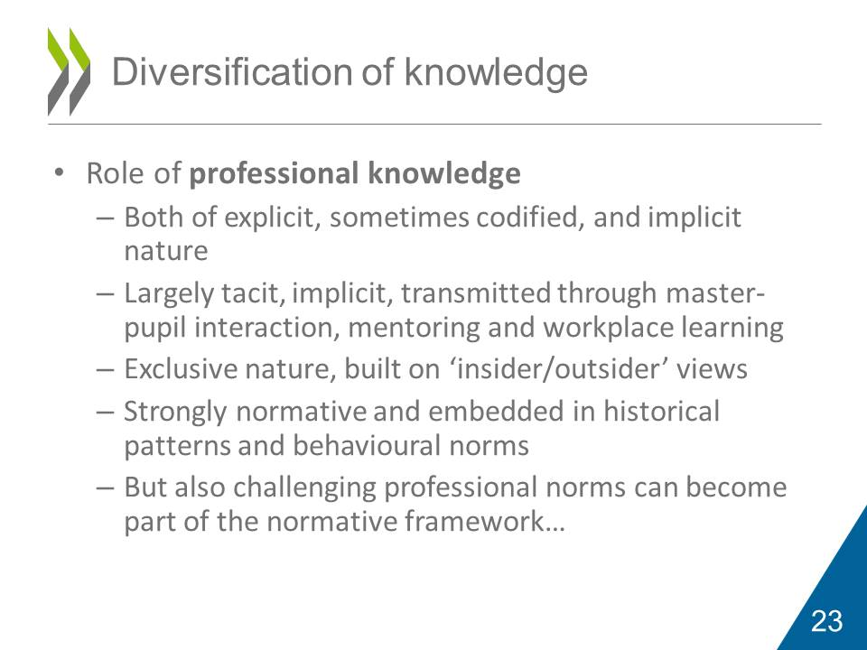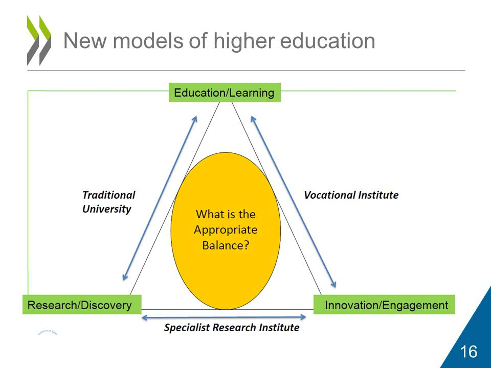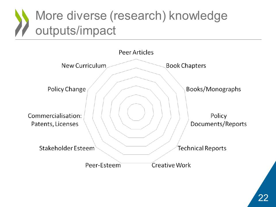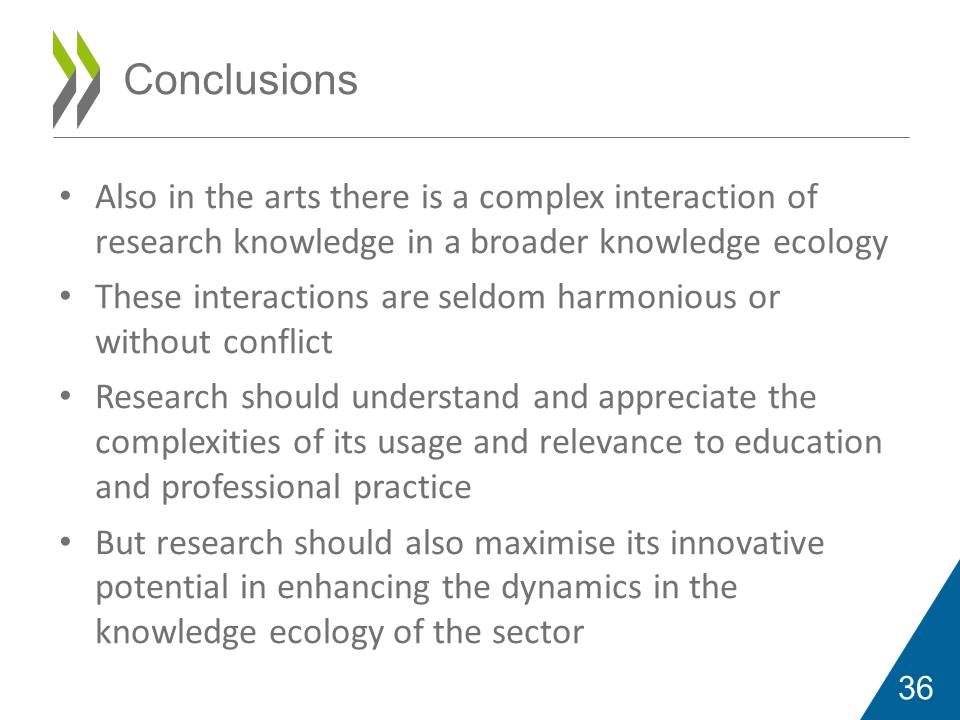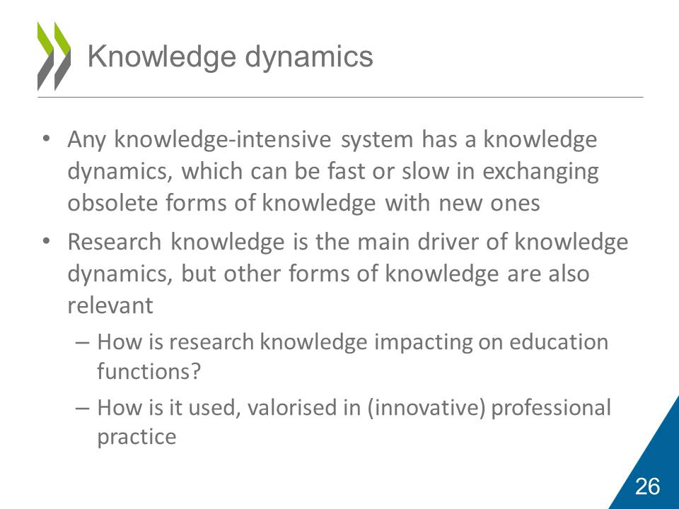 In any developed knowledge system there are various, and often competing knowledge systems. The metaphor of the ‘knowledge triangle’ offers a useful approach to analyse the relationships between the knowledge flows in research, innovation and education. Especially in higher education these three dimensions interact in often complex ways. The arts is no exception, but various forms of knowledge creation in the arts through research and innovation are still not fully developed, at least compared with other sectors. The arts also seems to be characterised by various other knowledge systems which compete with the others, such as the professional knowledge of the expert practitioner, the tacit knowledge of the initiated in a specific form or practice, or the specific knowledge systems associated with schools of thought and practice. Any sector needs to define its own ways in organising the knowledge triangle, in streaming the various knowledge flows on institutional patterns and in making them transparent to researchers, practitioners and professionals.