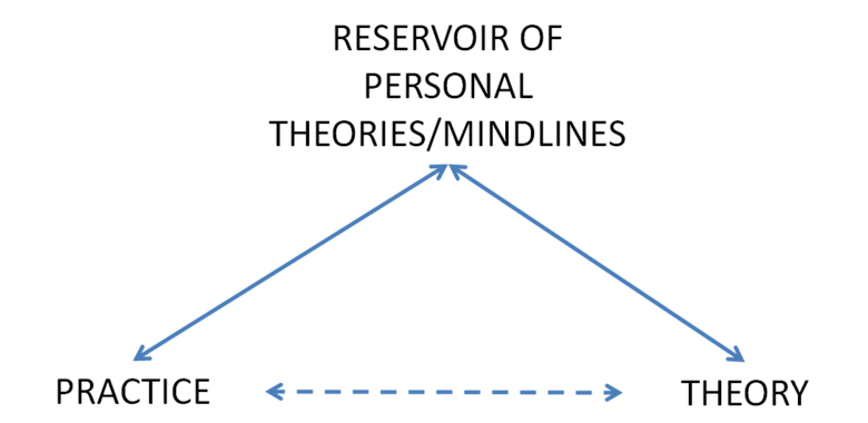 - The introduction of ‘personal theory’ as a mediator between theory and practice, thus creating a triangular model that adds dynamism and movement to the rather static and segmented nature of the epistemic map outlined earlier.
