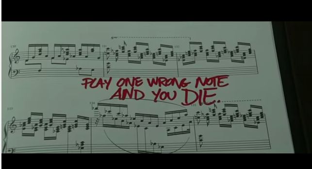 Norms are of course oppressive, which is why students, learning to behave within them, become aware of gradually increasing fear. Fear of making a mistake, fear of playing out of style, fear of non-conforming. With fear come stress, anxiety, and performance-related illness. The pressures on performers are terrifying, which makes it easy for last years’ B-movie Grand piano to imagine a pianist on stage turning the page to see this: