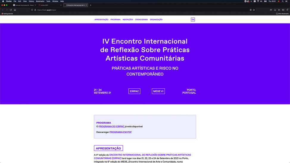 4EIRPAC — IV Encontro Internacional de Reflexão sobre Práticas Artísticas Comunitárias. Práticas Artísticas e o Risco no Contemporâneo (21-24.09.2022). Faculdade de Belas Artes da Universidade do Porto, Portugal. https://i2ads.up.pt/eirpac