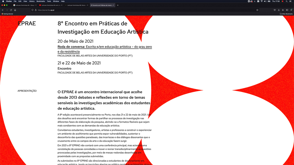8EPRAE — 8th Encounter on Practices of Research in Arts Education (20-22.05.2021). i2ADS/DEA, Faculdade de Belas Artes da Universidade do Porto, Portugal. https://eprae.fba.up.pt/