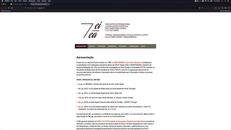 7ei_ea — Encontro internacional sobre Educação Artística: Práticas e Epistemologias do Ensino Artístico na CPLP: casos de Cabo Verde e Moçambique (04-06.10.2021). i2ADS/FBAUP, CNAD, EICM, FaED/Uni-CV, M_EIA, ARPAC, ECA-UEM, ENAV, INDE, ISArC, MoNo, SPAS, UP (Maputo), ESMAE-P.Porto, FBAUP/CIEBA, FPCEUP/CIIE, IE-ULisboa. Faculdade de Educação e Desporto de Cabo Verde, Mindelo, Cabo Verde. https://eiea.fba.up.pt/2021