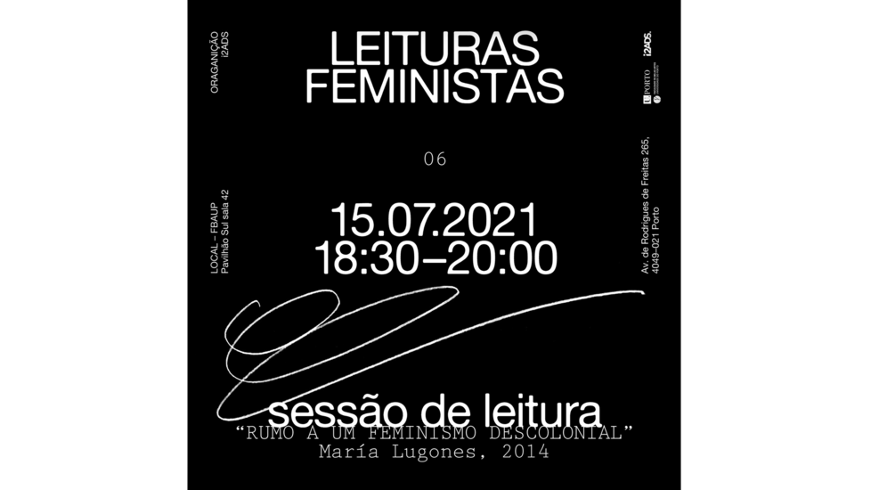 Leituras Feministas #6. “Rumo a um feminino descolonial”, María Lugones (15.07.2021). [Sessão de leitura]. Carla Cruz (Coord.). Faculdade de Belas Artes da Universidade do Porto, Portugal.