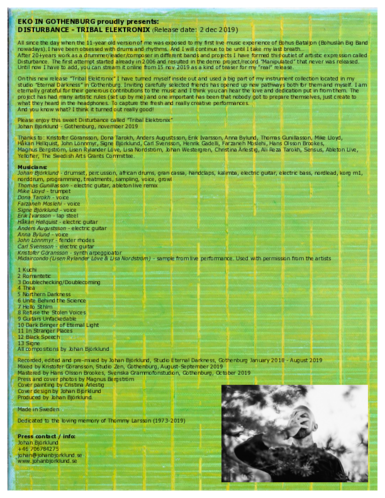 The result of this work is presented on the record: Disturbance -"Tribal Elektronix" (Eko in Gothenburg) released in December 2019.