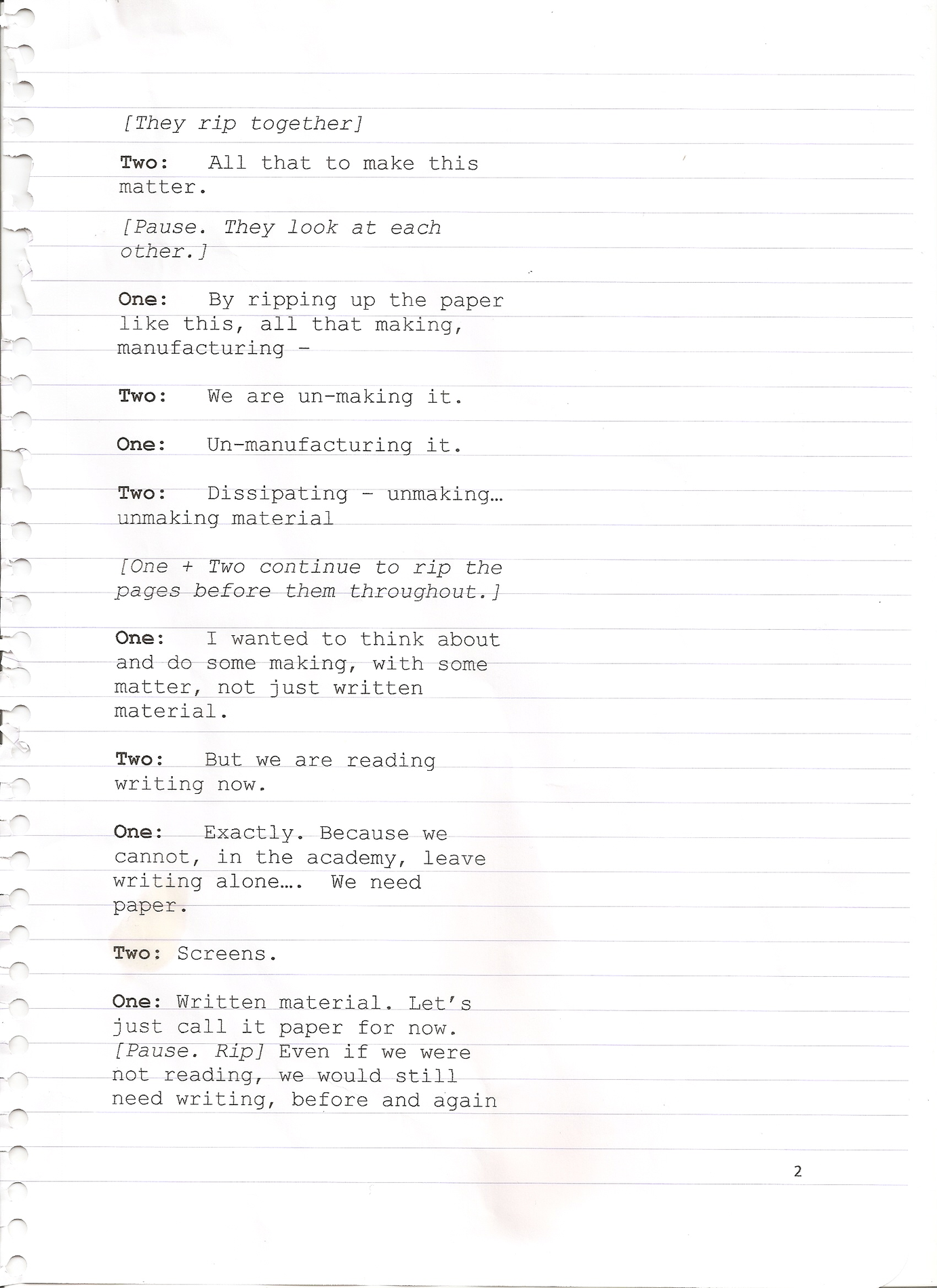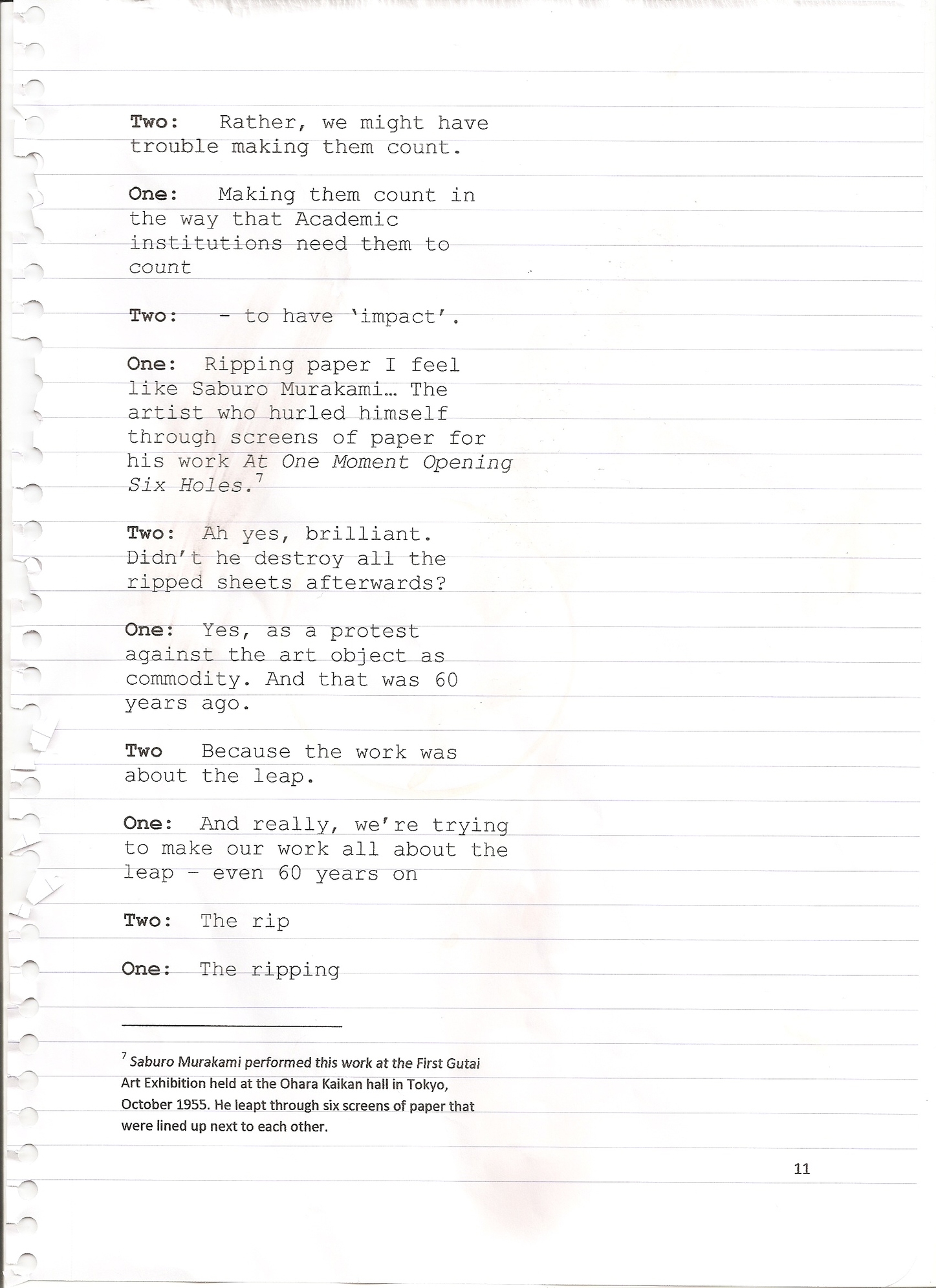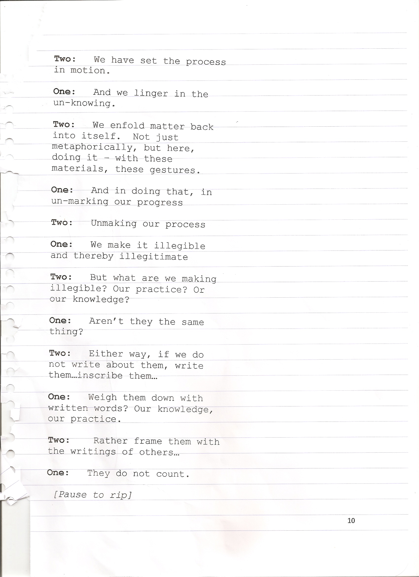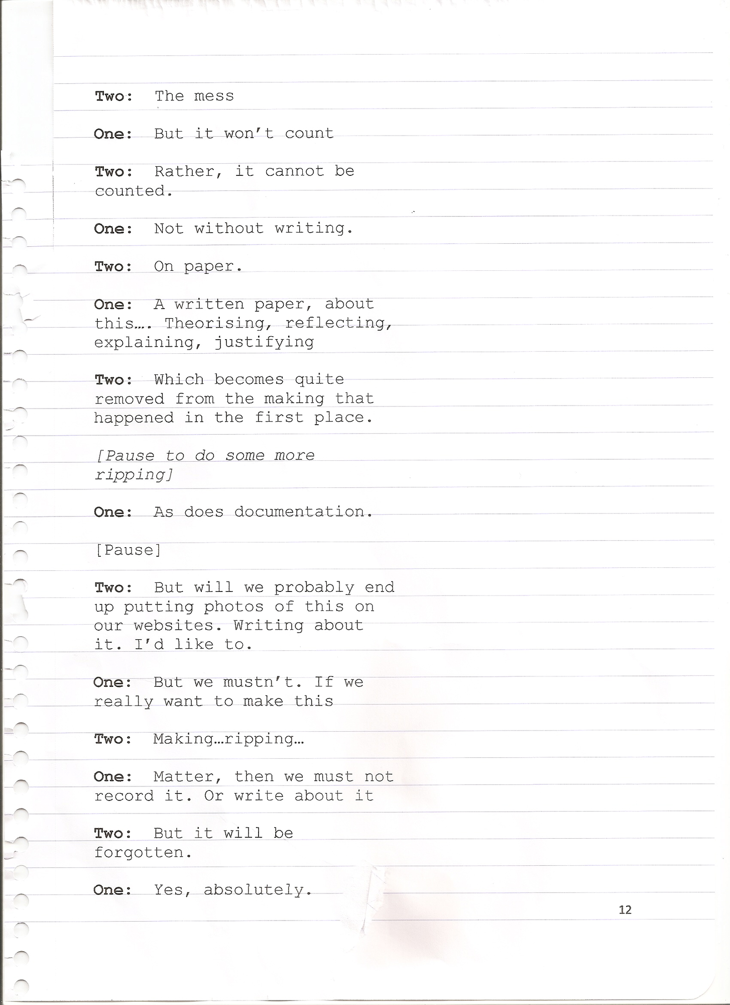 Professor Jane Rendell sets out one way to do this with her concept of Site-Writing (2010), which she calls a critical spatial practice. As a method, it explores ‘what it is possible for a critic to say about an artist, a work, the site of a work and the critic herself and for the writing to still “count” as criticism’ (2). The relation between the critic and the work under scrutiny becomes a ‘site’ of interest: a site worth investigating, a site to be creative in and with. By thoroughly investigating the transition between theory, criticism and practice, and viewing it as a ‘site’ in its own right, Rendell opens up new possibilities for the critic. She argues that critical thinking can be used to generate its own imaginative contexts, and urges the critic to develop alternative, more creative ways of writing. Indeed, this model of criticism becomes a practice in its own right. She says ‘The use of analogy – the desire to invent a writing that is somehow “like” the artwork – allows a certain creativity to intervene in the critical act as the critic comes to understand and interpret the work by remaking it on his/her own terms’ (7). The critic becomes an artist, responding to the initial artwork (without, of course, seeking to replace it). Here, we attempt to do something inspired by Rendell but also slightly different because, of course, as practitioner-researchers, we are at once the artists and the critics. Already we have chosen not to experiment with the form of this written contextualising section, typed and laid-out conventionally as it is, and in doing this perhaps have ‘transformed’ this stage of our response so much that it loses touch with, and has stopped engaging with our original performance. We made images (spoken, through dialogue, and visual, through performance) and unmade them (ripped the paper our notes were written on, refused to take pictures) but then realised that in order for them to be counted we needed to somehow make them again. So we put back into writing (typed this time) what we had destroyed (the script on the right) so that it could be read again. And we performed another ripping experiment and took photographs so that it could be seen again. The unmaking became a transforming, and at least the documents here, we argue, are performances themselves.