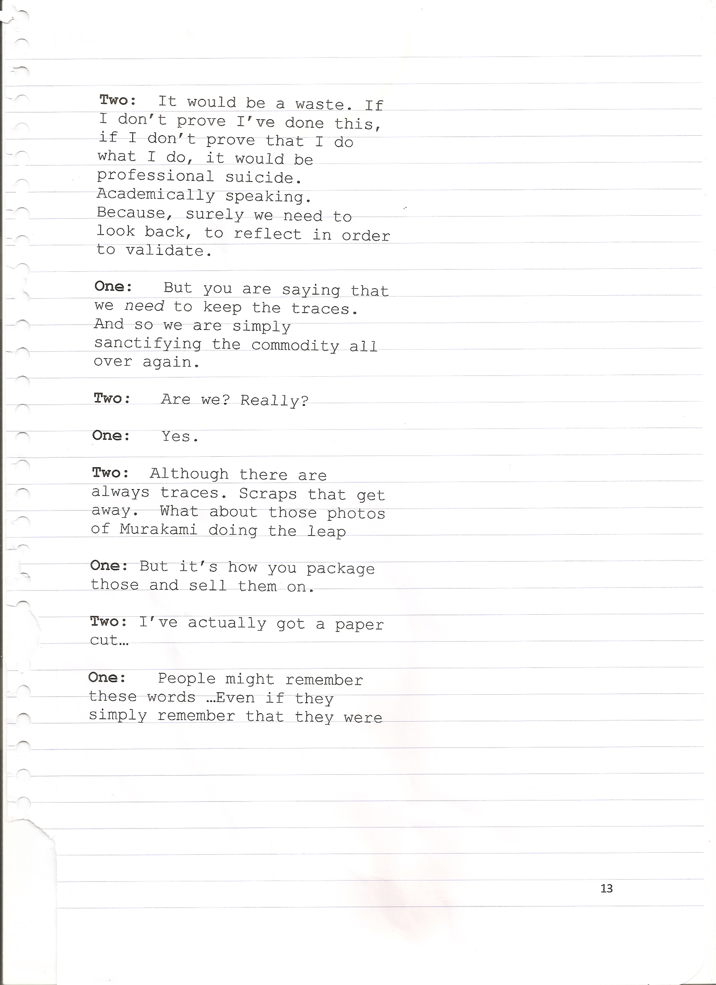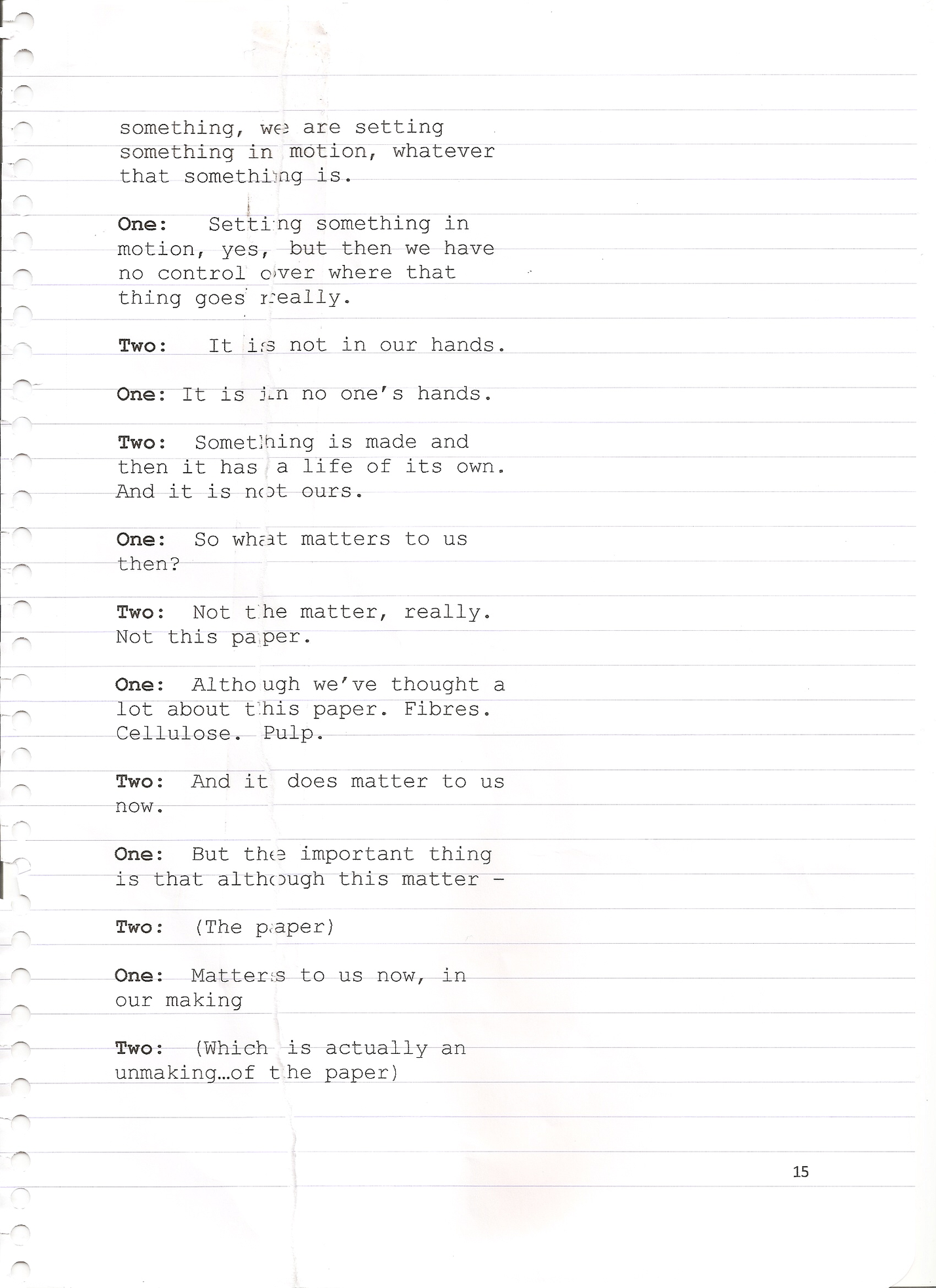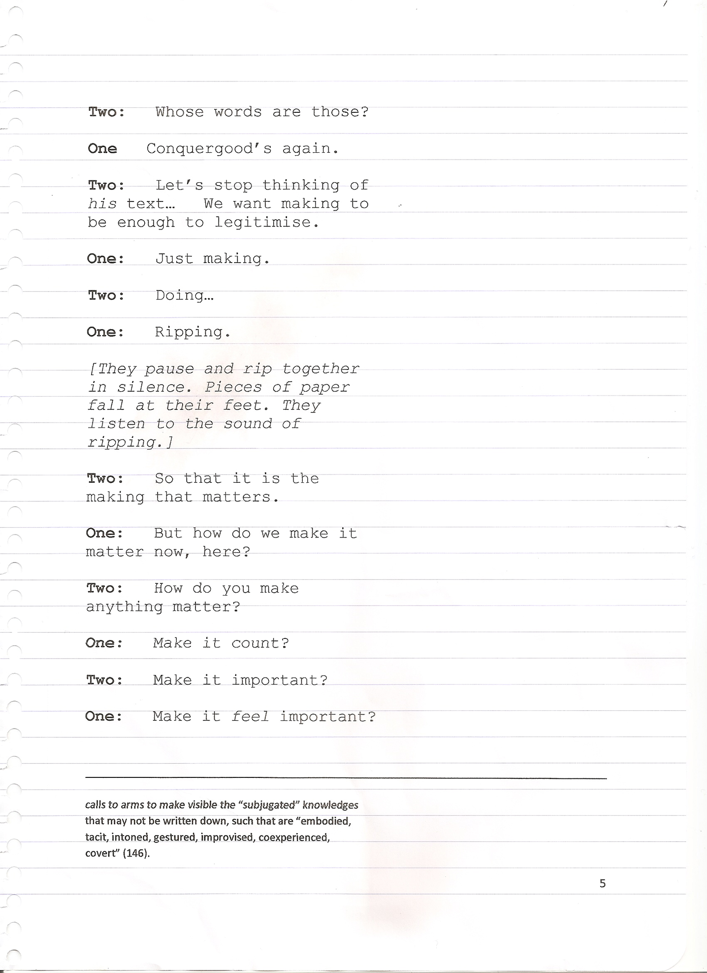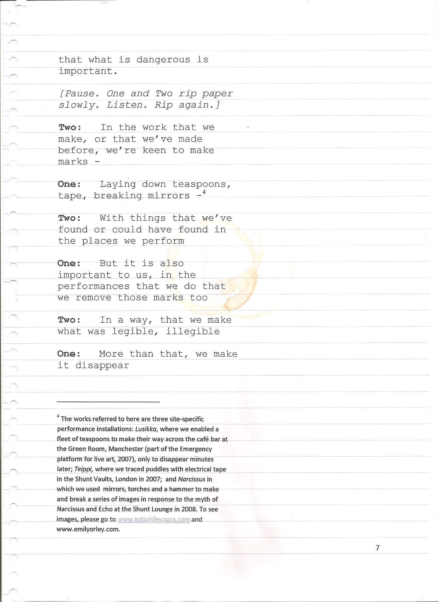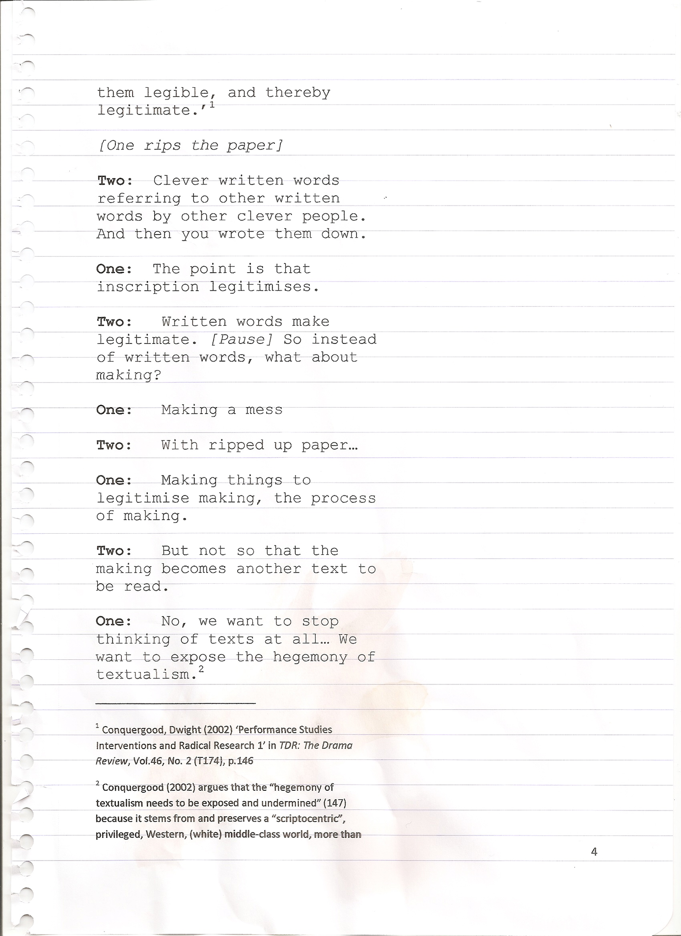Professor Jane Rendell sets out one way to do this with her concept of Site-Writing (2010), which she calls a critical spatial practice. As a method, it explores ‘what it is possible for a critic to say about an artist, a work, the site of a work and the critic herself and for the writing to still “count” as criticism’ (2). The relation between the critic and the work under scrutiny becomes a ‘site’ of interest: a site worth investigating, a site to be creative in and with. By thoroughly investigating the transition between theory, criticism and practice, and viewing it as a ‘site’ in its own right, Rendell opens up new possibilities for the critic. She argues that critical thinking can be used to generate its own imaginative contexts, and urges the critic to develop alternative, more creative ways of writing. Indeed, this model of criticism becomes a practice in its own right. She says ‘The use of analogy – the desire to invent a writing that is somehow “like” the artwork – allows a certain creativity to intervene in the critical act as the critic comes to understand and interpret the work by remaking it on his/her own terms’ (7). The critic becomes an artist, responding to the initial artwork (without, of course, seeking to replace it). Here, we attempt to do something inspired by Rendell but also slightly different because, of course, as practitioner-researchers, we are at once the artists and the critics. Already we have chosen not to experiment with the form of this written contextualising section, typed and laid-out conventionally as it is, and in doing this perhaps have ‘transformed’ this stage of our response so much that it loses touch with, and has stopped engaging with our original performance. We made images (spoken, through dialogue, and visual, through performance) and unmade them (ripped the paper our notes were written on, refused to take pictures) but then realised that in order for them to be counted we needed to somehow make them again. So we put back into writing (typed this time) what we had destroyed (the script on the right) so that it could be read again. And we performed another ripping experiment and took photographs so that it could be seen again. The unmaking became a transforming, and at least the documents here, we argue, are performances themselves.