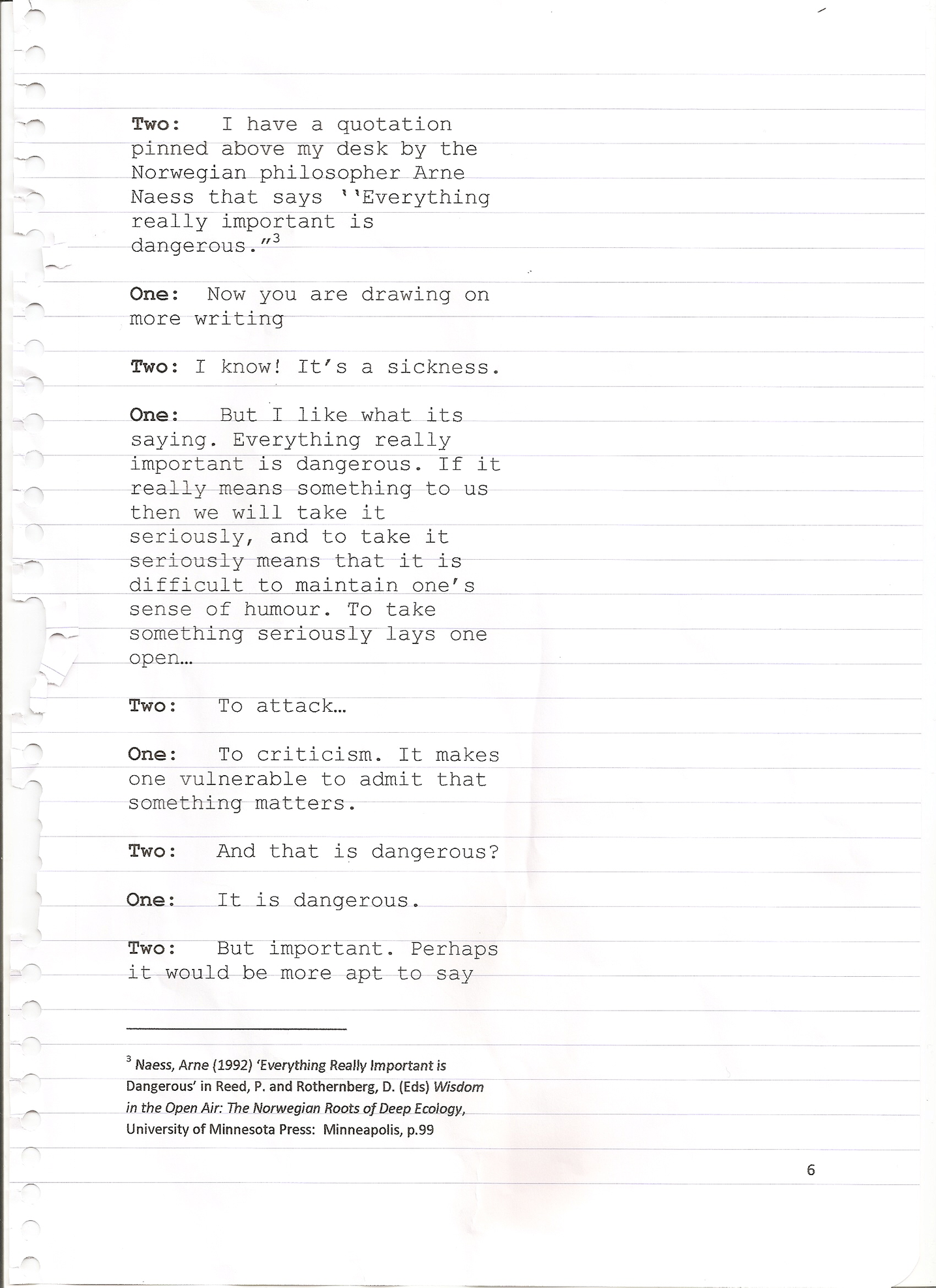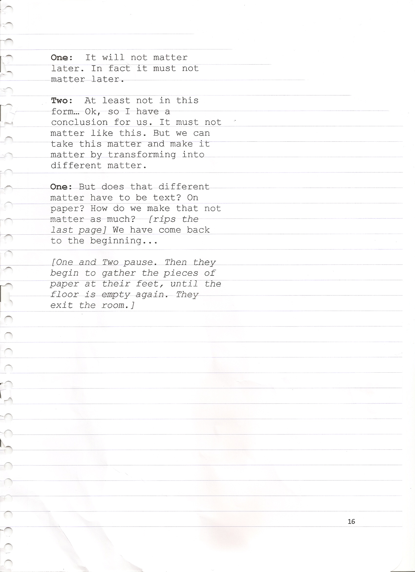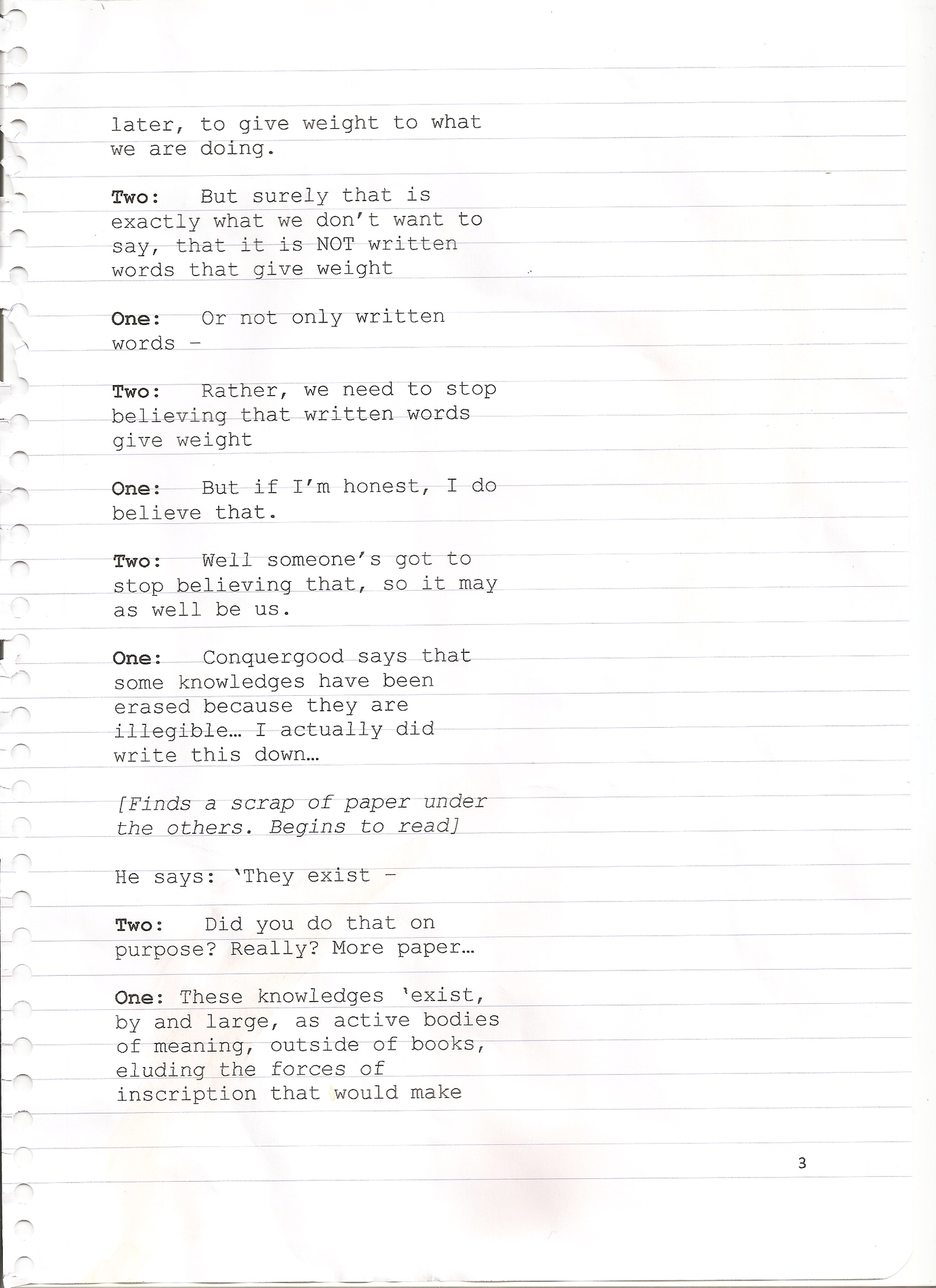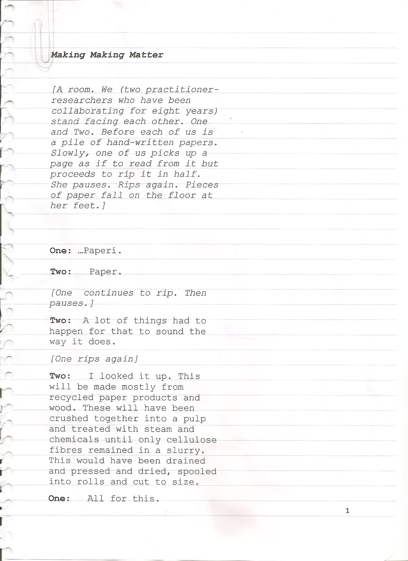 Professor Jane Rendell sets out one way to do this with her concept of Site-Writing (2010), which she calls a critical spatial practice. As a method, it explores ‘what it is possible for a critic to say about an artist, a work, the site of a work and the critic herself and for the writing to still “count” as criticism’ (2). The relation between the critic and the work under scrutiny becomes a ‘site’ of interest: a site worth investigating, a site to be creative in and with. By thoroughly investigating the transition between theory, criticism and practice, and viewing it as a ‘site’ in its own right, Rendell opens up new possibilities for the critic. She argues that critical thinking can be used to generate its own imaginative contexts, and urges the critic to develop alternative, more creative ways of writing. Indeed, this model of criticism becomes a practice in its own right. She says ‘The use of analogy – the desire to invent a writing that is somehow “like” the artwork – allows a certain creativity to intervene in the critical act as the critic comes to understand and interpret the work by remaking it on his/her own terms’ (7). The critic becomes an artist, responding to the initial artwork (without, of course, seeking to replace it). Here, we attempt to do something inspired by Rendell but also slightly different because, of course, as practitioner-researchers, we are at once the artists and the critics. Already we have chosen not to experiment with the form of this written contextualising section, typed and laid-out conventionally as it is, and in doing this perhaps have ‘transformed’ this stage of our response so much that it loses touch with, and has stopped engaging with our original performance. We made images (spoken, through dialogue, and visual, through performance) and unmade them (ripped the paper our notes were written on, refused to take pictures) but then realised that in order for them to be counted we needed to somehow make them again. So we put back into writing (typed this time) what we had destroyed (the script on the right) so that it could be read again. And we performed another ripping experiment and took photographs so that it could be seen again. The unmaking became a transforming, and at least the documents here, we argue, are performances themselves.