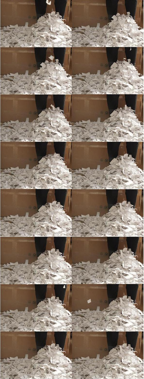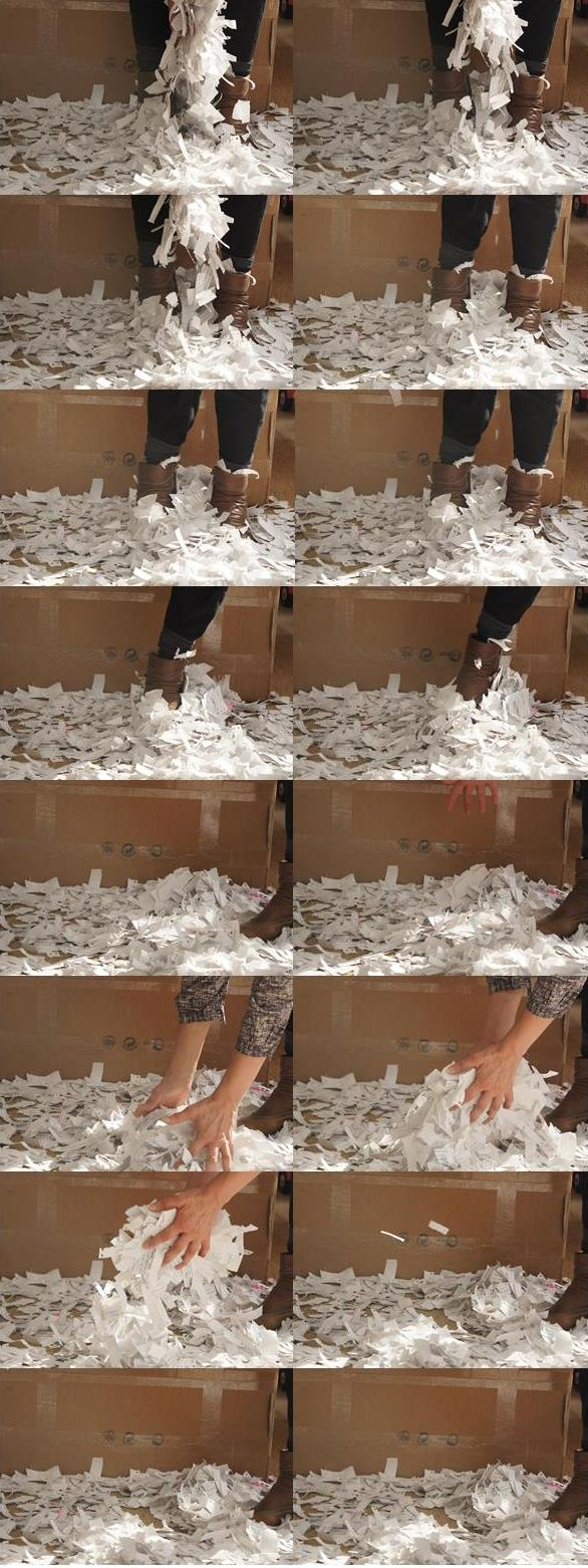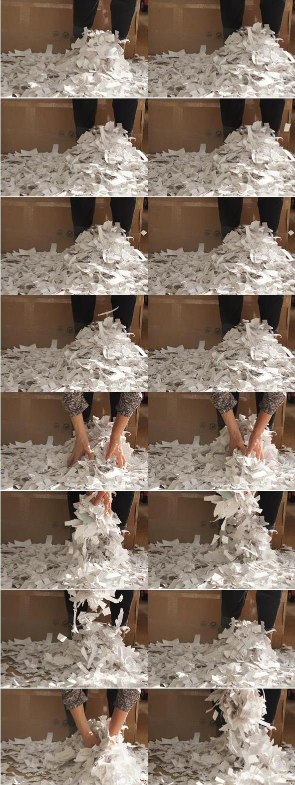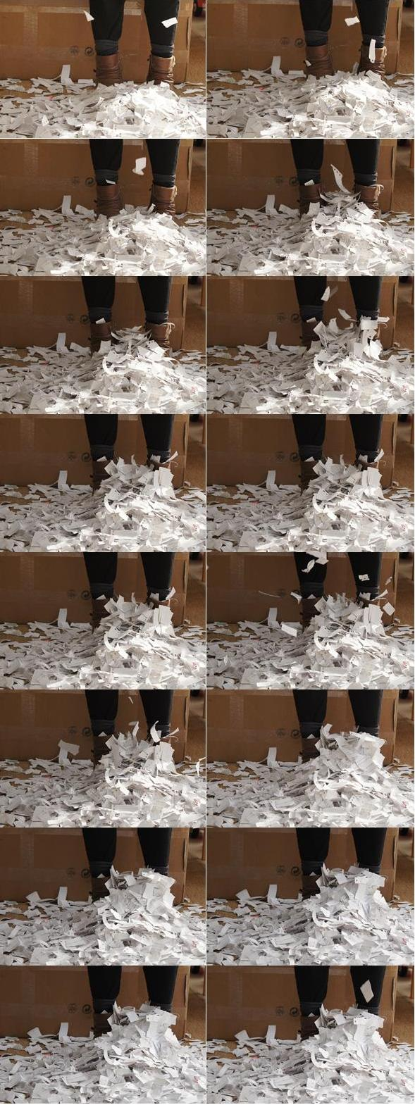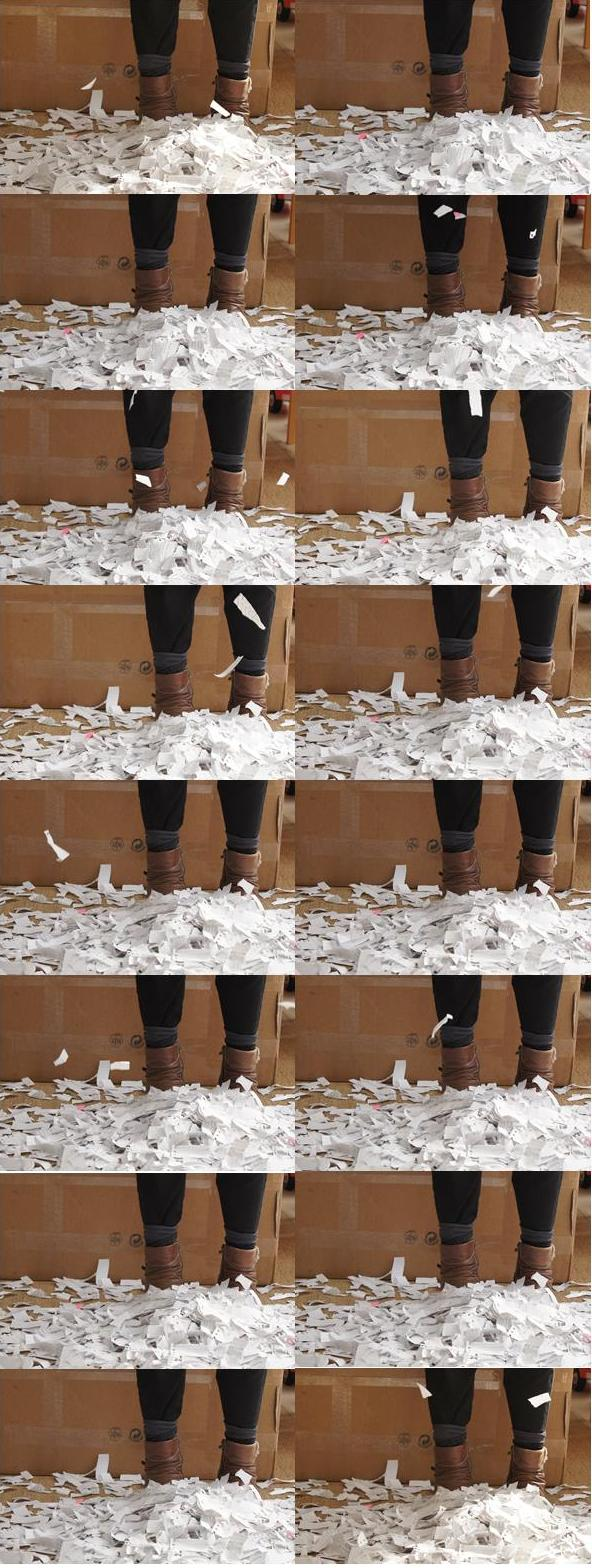What we present here on the right are documents from a performance originally presented in Helsinki in 2013 (http://nivel.teak.fi/carpa/), and then later in London that same year and again in 2015. The original performance involved a dialogue about our practice and research in which we threw the notes we were reading from into water. To re-perform the dialogue a few months later, we re-wrote new notes and this time ripped them up while talking. And then we did it again. In order to reflect upon this act here, we decided to type the dialogue again (now in its fourth version) and present it alongside this series of photographs of one of us ripping up all the notes we had taken during the process it took to create the work. Just as Francis Alÿs’s block of ice did not disappear, but was eventually transformed into a five minute documentary, so our dialogue-performance has been transformed for and into this exposition. In the context of academic research, rather than saying ‘Sometimes making something leads to nothing’, in fact we are saying that ‘Sometimes making something leads to something different’. And that ‘something different’, although required to take the form of a scholarly output, is in fact just another part of the artistic process and should be treated as such. Indeed, in order to honour the tacit knowledge gained in the first place (and at first hand) the scholarly output can and should be approached in an inventive and experimental manner. It can ‘remain differently’ and still be counted.