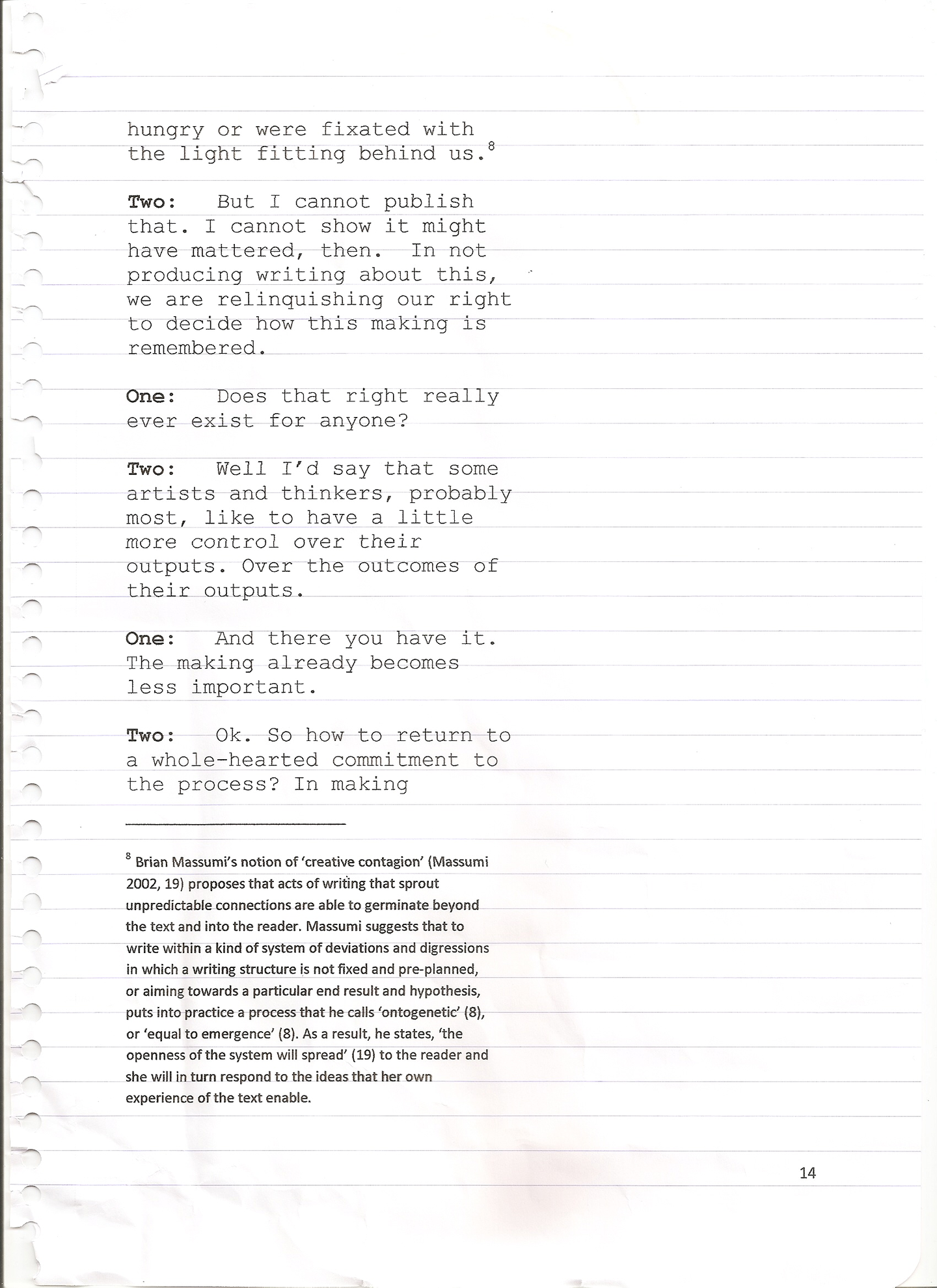 Importantly, we hope that the transformation does not stop here but that it keeps changing in the reader’s (your) ‘flesh memory’ (Schneider 2001: 105), that it has immaterial repercussions we cannot measure or account for. The reverberations of making (and recording and thinking about that making) that we present here might lead, we hope, to a transmission of a desire to be creative. Here we are drawing on, in particular, Brian Massumi’s notion of ‘creative contagion’ (2002: 19) and Jane Bennett’s ‘mood of enchantment’ (2001: 4) which both place value in the intangible processes and encounters that bring something new to the world, however small. In Parables for the Virtual (2002), Massumi writes about the self-augmenting world, in which even the smallest efforts at production bring something new to the world. He argues that activities dedicated to writing and thought, are (or at least can be) inventive, even though they might augment only on a microscopic scale. Set against the academic thesis requirements of originality, significance, rigour and contribution, ‘techniques which embrace their own inventiveness’ (13) can be difficult to prioritise, and yet, Massumi argues, must be prioritised, at least some of the time. He calls for ‘affirmative methods’ to balance the negative critique that academics are trained to produce, methods that add ‘that ounce of positive experience to the world’ (13). In The Enchantment of Modern Life (2001), Bennett, in a similar vein, argues for the rediscovery of a sense of wonder in everyday life, seeking to reverse the cynical and disenchanted effects that modern and postmodern critical theory have produced. She suggests that the ‘affective force’ of moments of enchantment might be used to ‘propel ethical generosity’ (3).She writes that ‘one must be enamoured with existence and occasionally even enchanted in the face of it in order to be capable of donating some of one’s scarce mortal resources to the service of others’ (4). As she notes, ‘the more aware of wonder one is – and the more one learns to cultivate it – the more one might be able to respond gracefully and generously to the painful challenges posed by our condition as finite beings in a turbulent and unjust world’ (160).