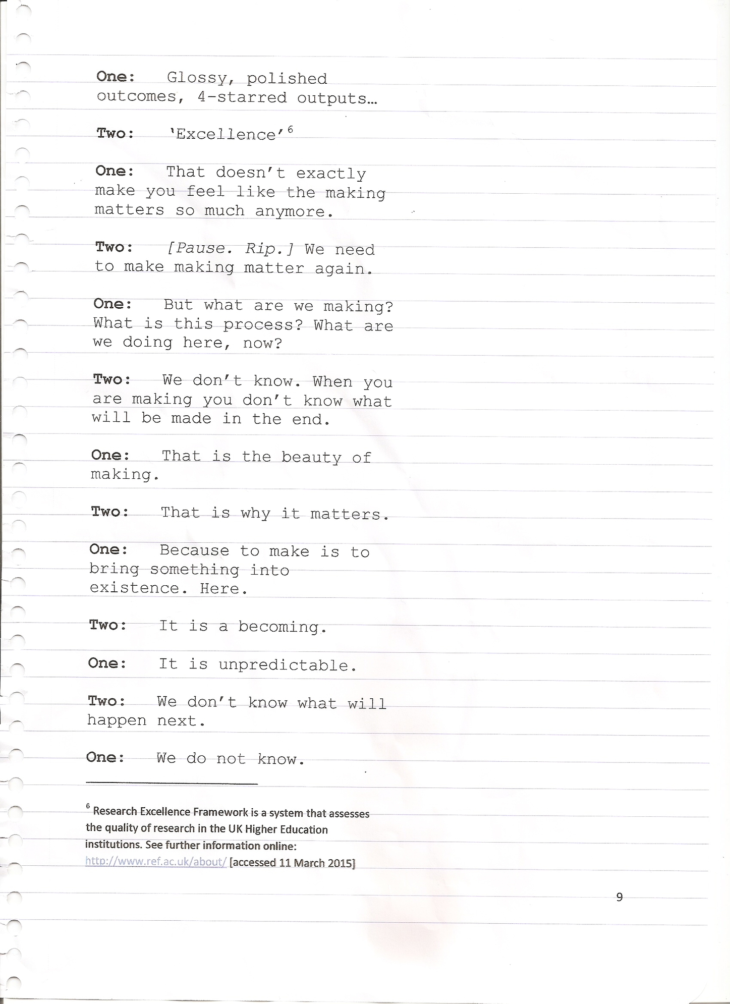 And so our exposition has one main aim: to raise awareness of the current obsession with the scholarly output, which in fact allows more space for the process and for experimentation than is often assumed. There is a sense of helplessness and cynicism that exists within university humanities communities at the moment and we hope to challenge this with a call for experimentation and transformation. Of course, in experimentation there is always a real possibility for failure: outcomes are indeterminable which can be both upsetting and unbalancing. They are, as Kershaw and Nicholson write, ‘reflexively unpredictable’ (2011: 9) but should and do still count. We suggest that the outcomes of artistic research be transformed into scholarly outputs that are inventive experiments themselves, that might not fit into existing moulds, that might include more than words and images on paper (or screens). We tried here and failed in some ways (resorting, once again to images and words on this virtual paper, framed by yet more words written down), but we will try again in the hope that the creative process does not stop once the output is delivered, but keeps augmenting. Because sometimes making something can lead to something different and something different and something different again.