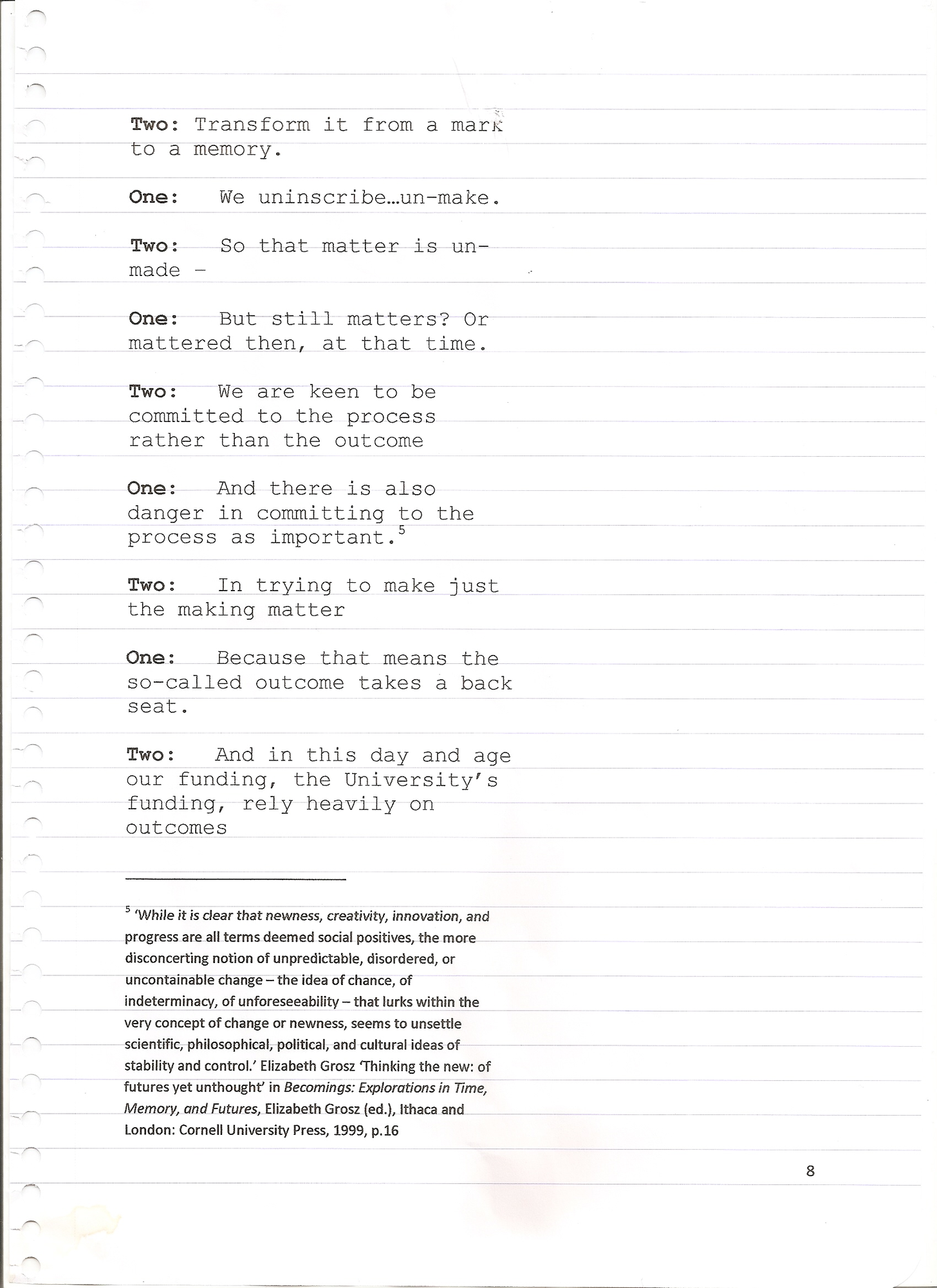 And yet, while we celebrate the intangible nature of performance (and the process that disappears) as artists, as practitioner-researchers we also need to find ways to frame, remember and critically reflect upon the event-that-is-no-more. For scholarly research purposes, the tacit knowledge gained from praxis needs to be made explicit, further evidence needs to be adduced (Nelson 2006: 112). We need, as Baz Kershaw and Helen Nicholson write, to find ways around the ‘unhelpful dichotomies and fixed binaries which separate embodiment and intuition from intellectual practices, emotional experiences and ways of knowing’ (2011: 2). It is here that Rebecca Schneider’s writing becomes very useful. She challenges Schimmel’s reading of the artists’ ‘orientation towards destruction’ (Schneider 2011: 98) and questions why the disappearance discourse equates performance ‘as a matter of loss’ (98). She re-thinks performance not as ephemeral but that which ‘remains differently’ (2001: 101), transformed into knowledge that resides in the body, in memory, ready to be communicated to other bodies. We propose that to acknowledge and indeed foreground this transformation is a key component of the practitioner-researcher’s work. Indeed, it is helpful to view the entire artistic research process as a series of, we would like to argue, creative and experimental transformations.