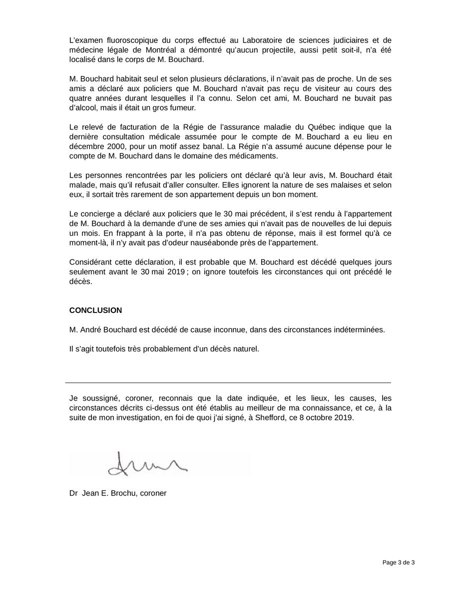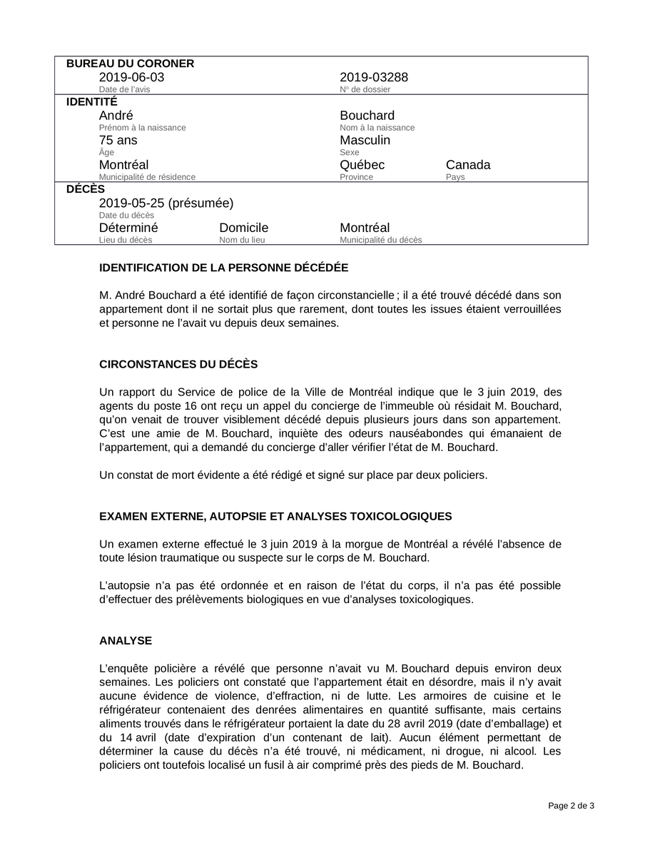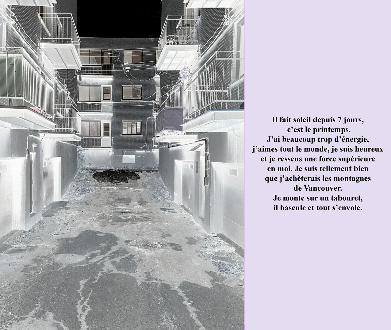 D’autre part, pour m'aider à développer mes récits, je me suis déplacé sur les lieux de leurs dernières habitations pour cartographier leurs milieux de vie et m'immerger dans leurs environnements. La photographie et la vidéo me permettront d'archiver ces infiltrations. Ce travail prendra donc la forme d'une enquête artistique, puisque je travaillerai aussi ces archives, les rapports des coroners, et la liste des corps non réclamés qu'on peut aisément trouver sur le web. Derrière ce projet, l’idée serait de rendre la dignité à tous ces défunts en conjurant leur absence par le récit et par l’image ; il s'agit d’évoquer leur aura, de leur accorder une nouvelle présence au monde. Je désire dialoguer avec les morts de ces inconnus par des récits équivoques mi-réels, mi-fictifs, et faire émerger de nouveaux rituels pour essayer de rendre de la dignité à ceux qui sont morts sans qu’aucune famille ne soit venue les célébrer. À travers la mort de ces grands oubliés, je vais réactualiser leurs morts dans une perspective d’une célébration de ces défunts lors d’une réception qui sera organisée sur invitation pour célébrer le départ de ces corps non réclamés.
