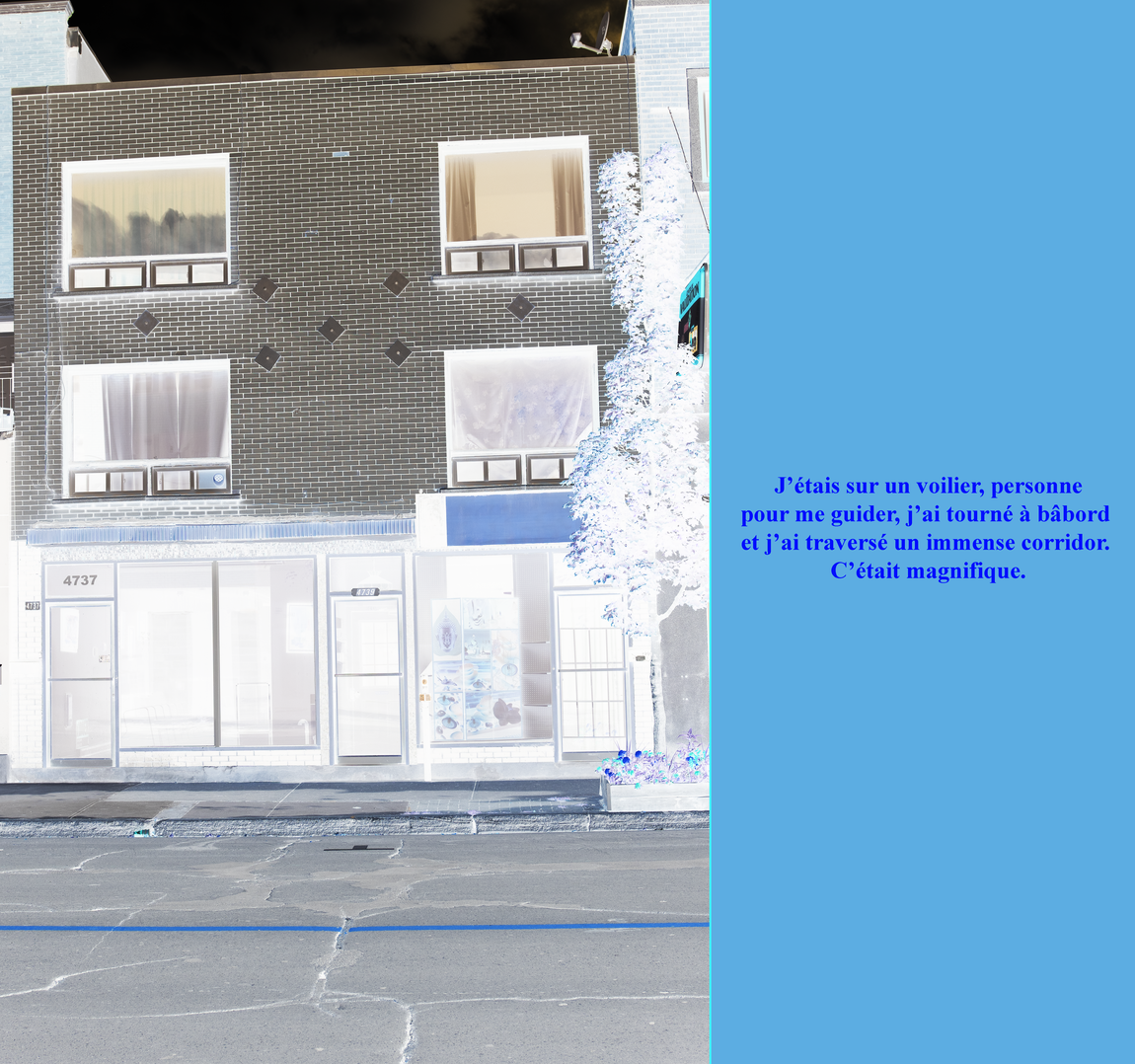 Une vidéo sera projetée, et elle provient des échantillons sonores urbains tout en insérant des images fixes (des visages flous) en incrustations. L’image en mouvement (la vidéo) deviendra le dispositif principal pour mon projet d’exposition de fin de maîtrise.