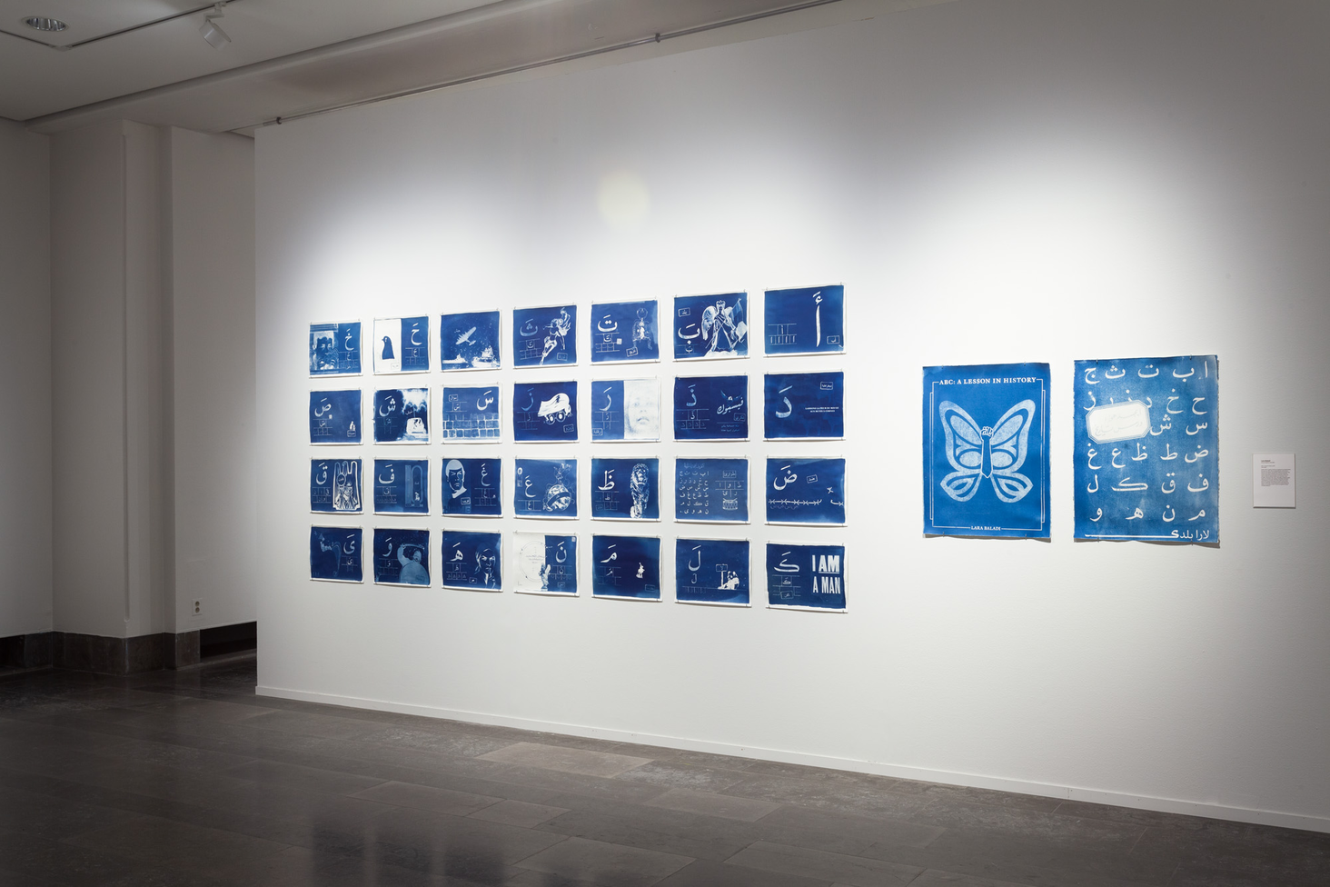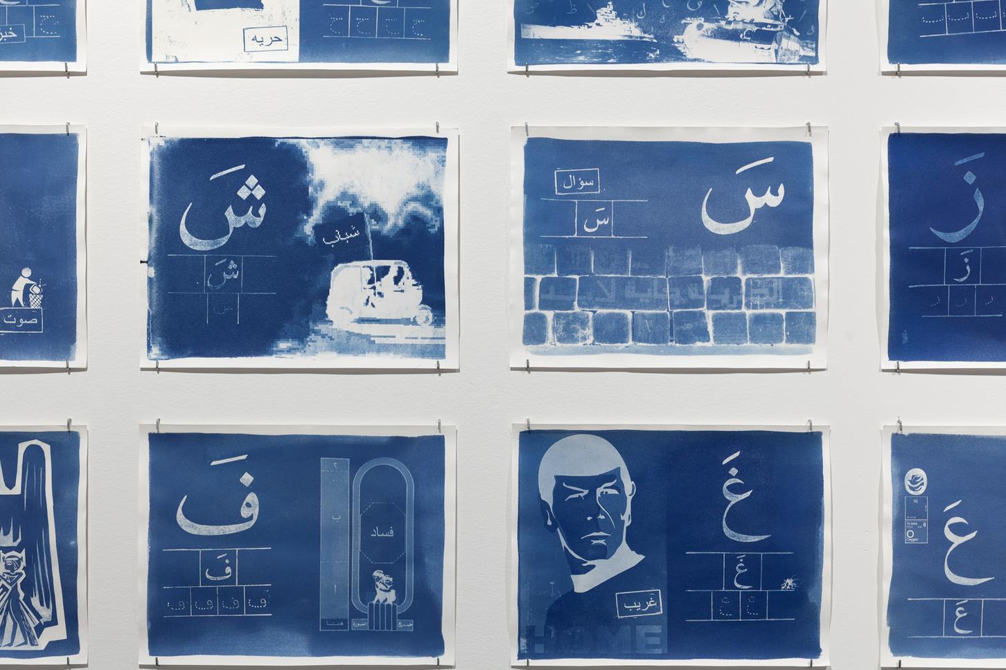 Lara Baladi engages with the montage tradition and describes her poetic and pressing work ABC: A Lesson in History as “inspired by 1950s propagandist educational books.” Her images are vividly blue in colour: “Each plate is printed on watercolour paper using an analogue [photographic] process: cyanotype. These cyanotype prints, reminiscent of the blueprints of engineering drawings, inscribes the ABC as the core language—and structure—to engineer a revolution.” In January 2011, Baladi was one of the hundreds of thousands of people across Egypt who took to the streets in protest against President Hosni Mubarak. “In the context of Tahrir Square, in a country where photography had been banned in most public spaces until 2011; where if you were photographing you were assumed to be an Israeli spy; where (anti-camera) propaganda helped generate paranoia, fear, and mistrust between people… literally overnight, the camera became one of the most efficient ways to counter the state and its security apparatus.”