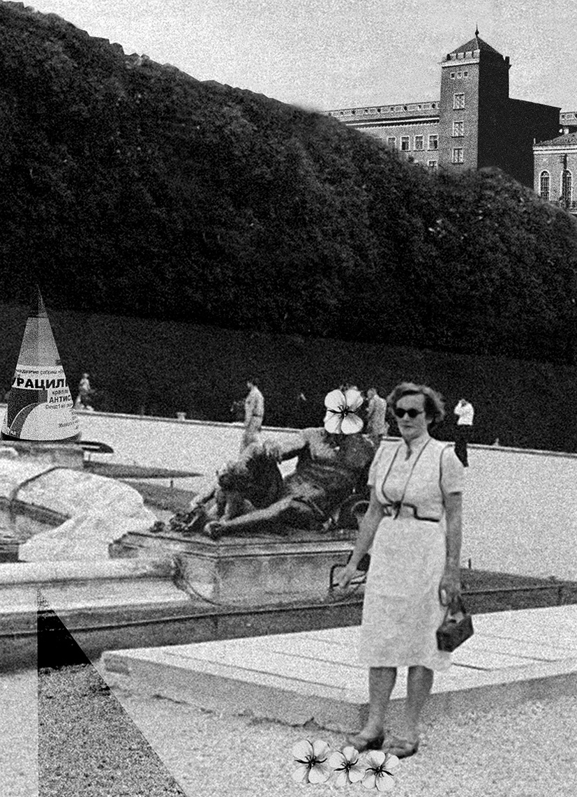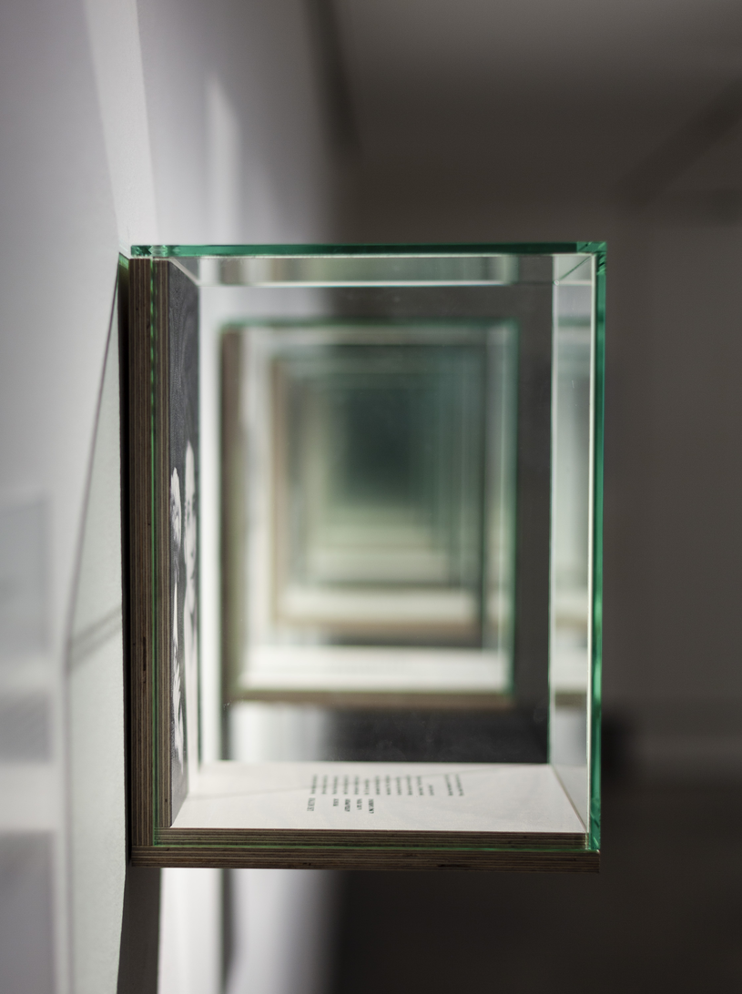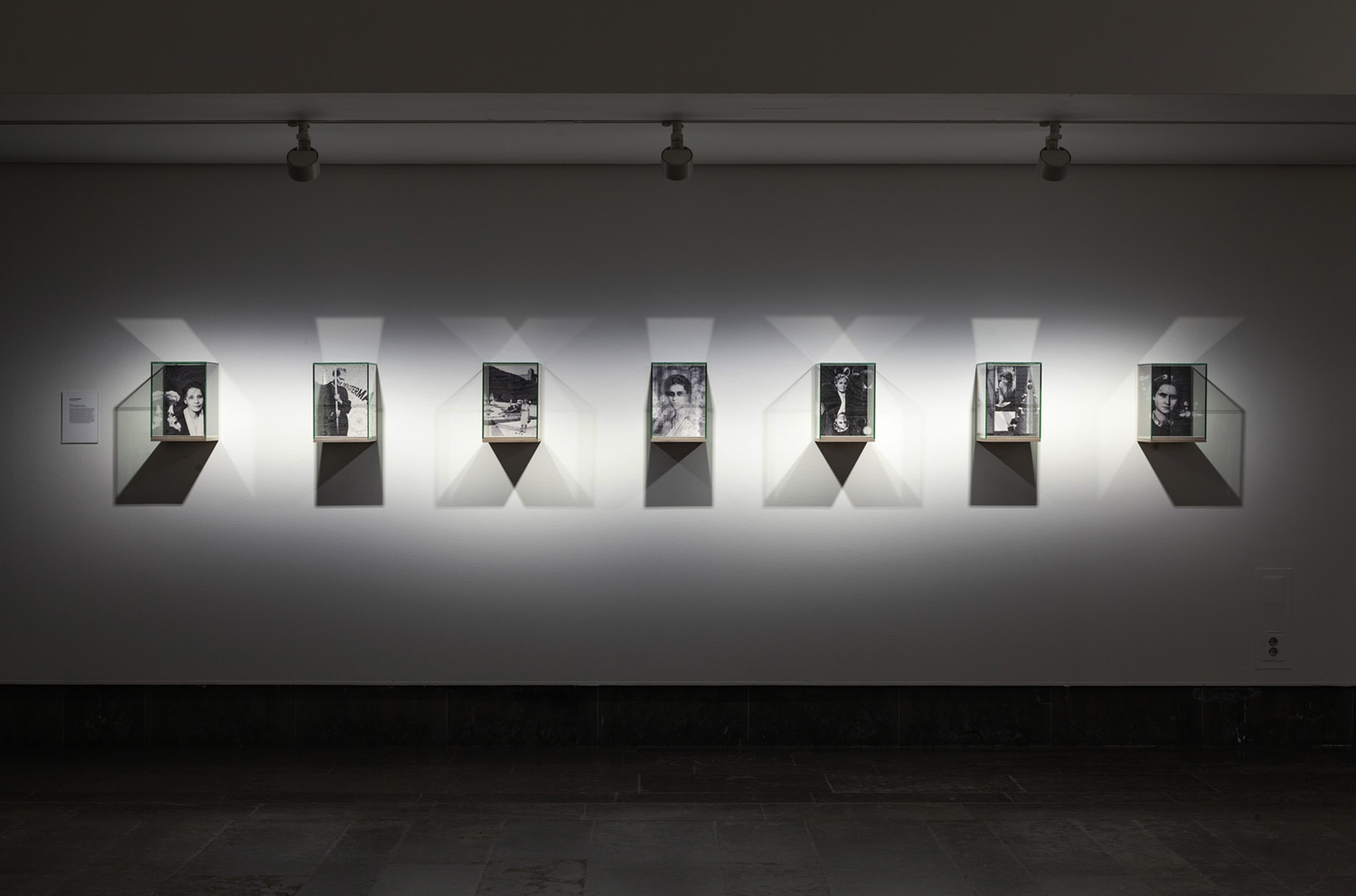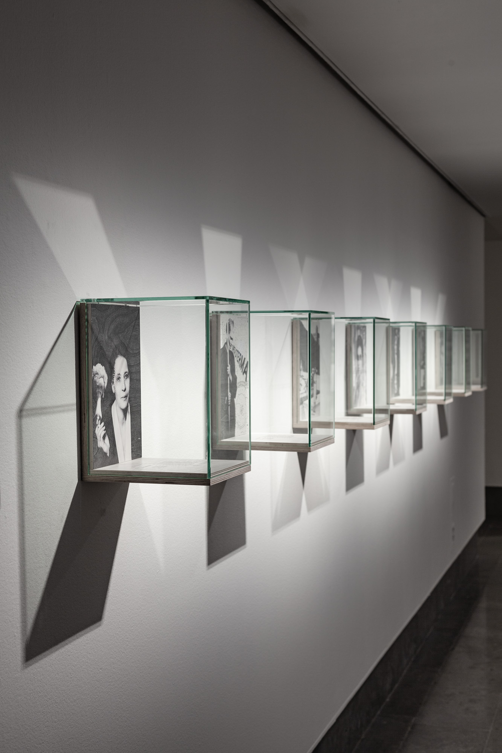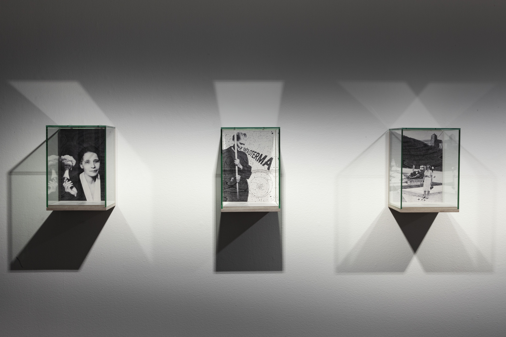 Format: Seven digital montages printed on birch plywood mounted in glass vitrines, each 21×29×22 cm.