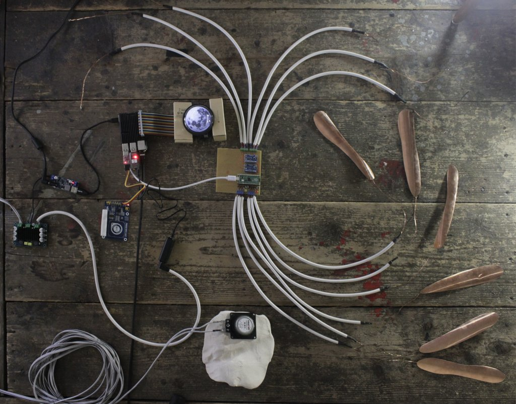 In the past ten days, I spent a lot of time advancing the building of a sensor interface for the prototypical Rogues piece mentioned before. This is perhaps a rather tedious and technical process, understanding new technologies I have not worked with before, such as the Pi Pico and capacitive sensors, also trying to see how I could extend my existing software to the visual domain (so far it failed miserably in terms of its performance compared with Processing); on the other hand, I think it is an important process of “approaching” the object. While you are there, stripping wires or soldering parts, you think about this “thing” that is going to be the interior of the object. It's dimensions, its tactility, even if eventually hidden from the viewer. You think about dimensions, you imagine the object that does not exist yet. I keep wondering what it would mean to give it into the hands of others to compose sounds and images for it.