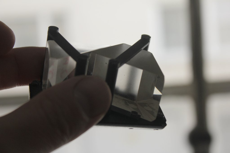 Optical prisms, secured with a metal frame and screws, to redirect light. This was a gift to me from Naya, but like all materials shown here, I haven’t used it yet in a piece.