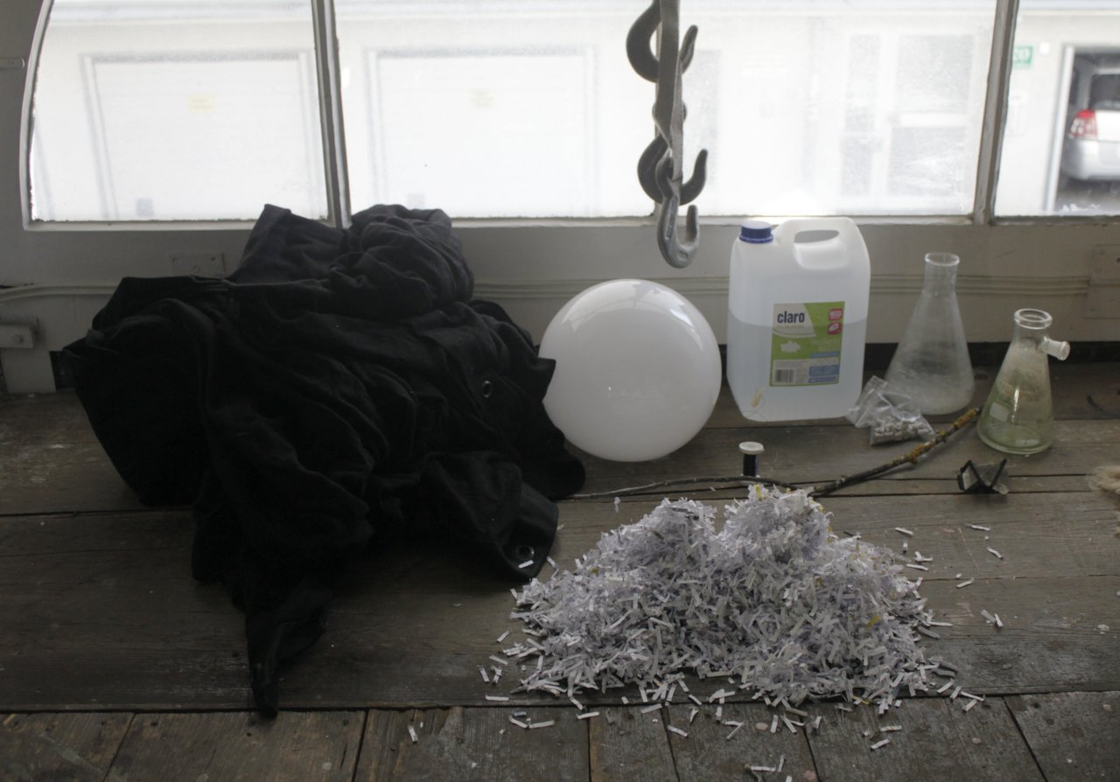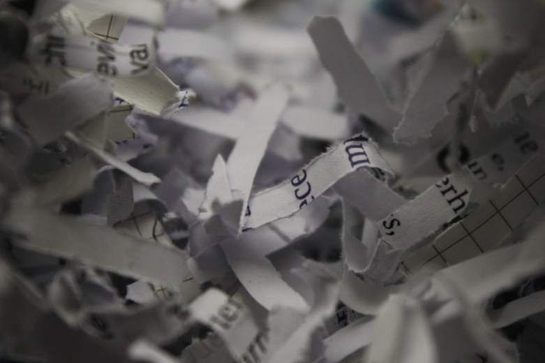 Shredded paper, mostly white with black lettering. Could become a volume or a surface. Available in larger quantities.