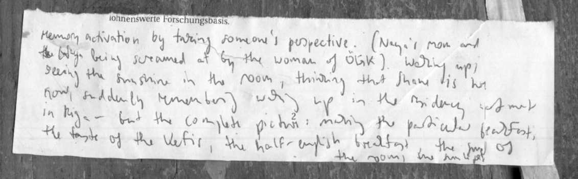 Memory is activated by taking someone's perspective ; one remembers a situation by observing (or imagining) someone else who might be in a similar situation. On Saturday or Sunday, when I woke up and the sun was shining into the room, I was thinking of Shane being in Graz now (staying in mur.at's apartment that I also had seen for the first time), and this made me "think of" a residency I did in Riga several years ago. The wording "think of" isn't that good, it's more that the image is coming back, it's not a "mental effort" or "deliberation", simply the return of the memory. I had the complete picture: Me in the one room apartment, which was separated from the gallery—actually quite a distance to walk. How I made breakfast, the kind of texture, smell and taste of that breakfast, for instance with the particular Kefir that is sold in the supermarkets of Latvia, or the baked beans and fried eggs I ate as a sort of "half-English breakfast". This memory activated by thinking about the situation of someone else doesn't seem to be an occupation of their position or location. It's not necessarily empathy, yet, in its full scale, more a rudimentary stage before that, just a way to connect, as yet without an explicit exchange.