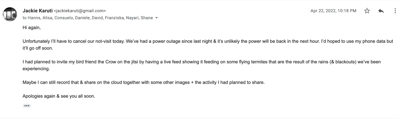 - How to move something from Nairobi to Graz. Thinking of objects and how gravity & light years affects their movement & how we intercept images in Space & Time.