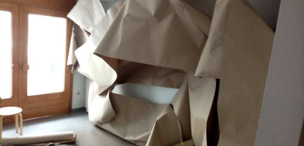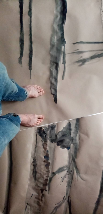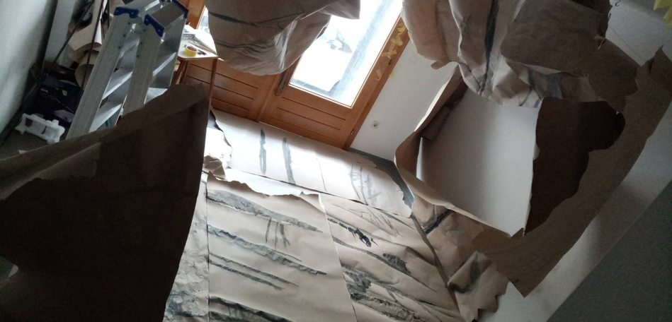 Tape does not hold large sheets of paper to the wall. I know this, and yet I keep trying. But I have more materials now, including paint and some new brushes, and this means I can develop the aesthetic in the space a little more. Takine the charcoal drawings I did at Schattenberg, I begin to create more giant scrolls of lined paper which will form the walls of this liminal space.