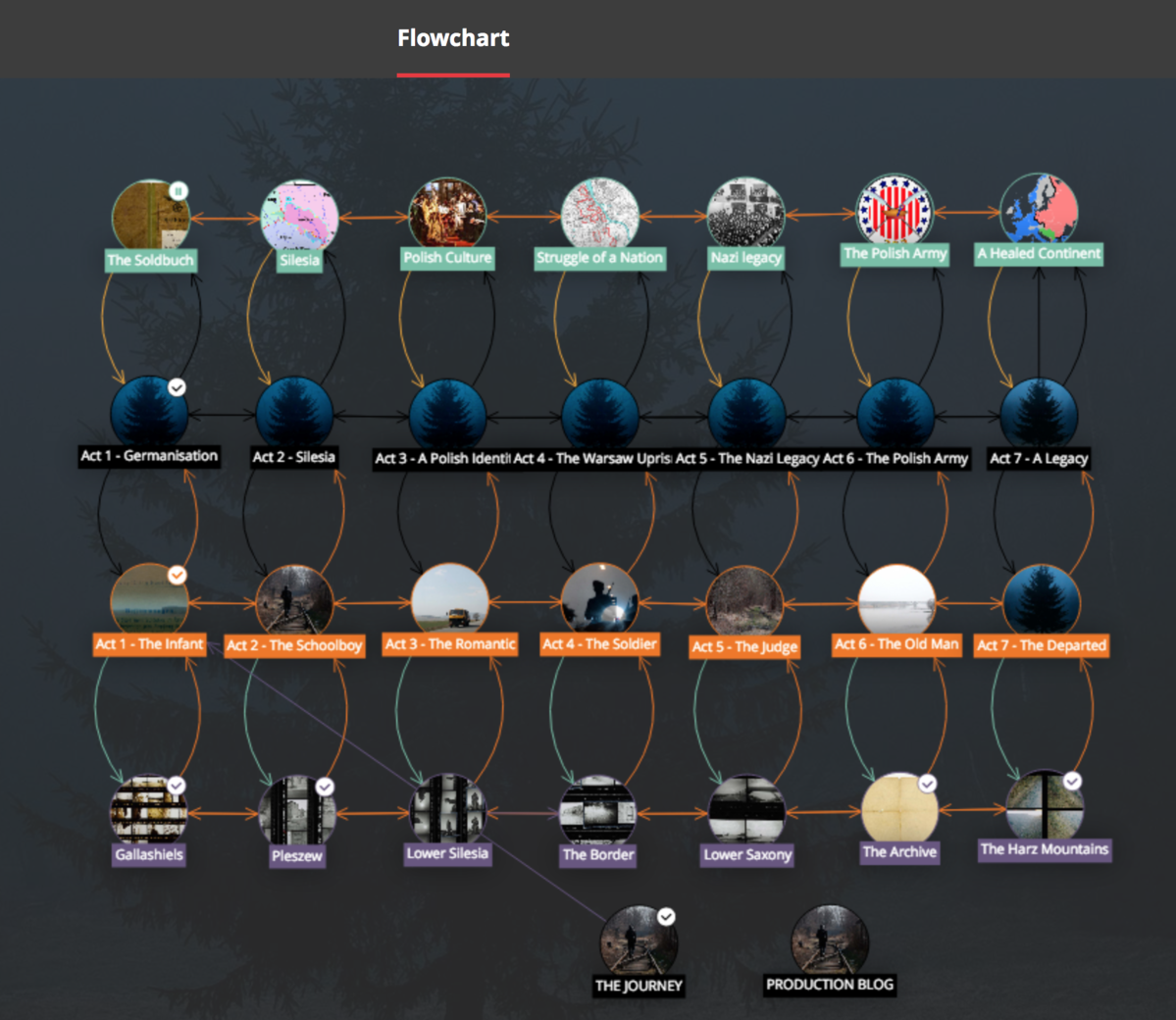 A Polish Journey is an interactive ‘road trip’ in which Julian Konczak travels through Central Europe to try and make sense of his father’s forced recruitment into the German army, his ultimate migration to the UK and the legacies of this for his own identity and his relationship with his now adult son. The narrative unfolds over seven ‘acts’ arranged chronologically, documenting the journey through practices of image making. Accompanying this seven-act video narrative is a networked database of materials that is both evidentiary and evocative. The database literally surrounds the central narrative, inviting the viewer to scroll up or down in order to understand more of the historical context or to engage with elements that seek to evoke place. Konczak describes this as a multilevel narrative structure, in which each fragment is self-contained while contributing to an overall narrative arc . A ‘flow map’ allows the user to see this multilevel narrative .