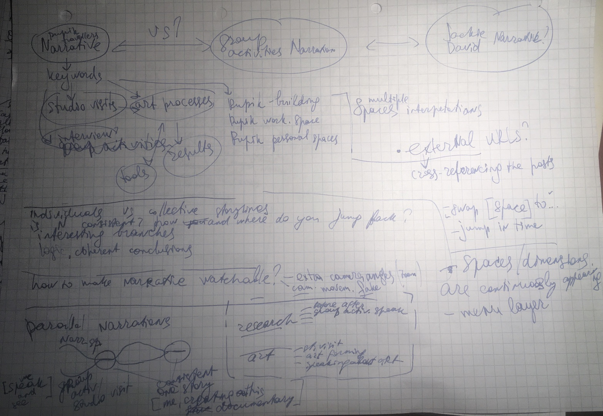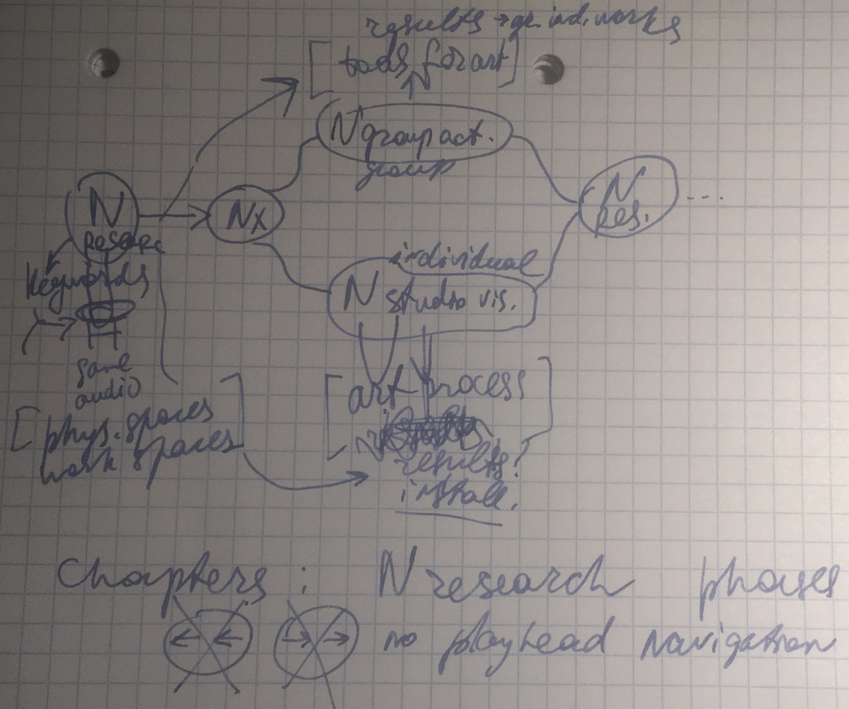 - after the "chapter" we have a decision point "Nx", which requires user to decide either he/she wants to watch a group dynamics - group activity cut (with keywords referencing to the tools and individual resulting works after the group activities) or an individual dynamics - studio visits with cross-referencing with the process of art creation (keywords - installation, artistic results of the swap space)